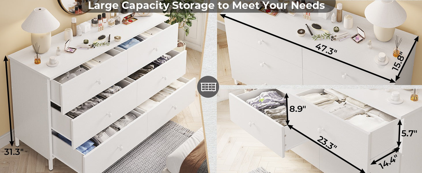 • Large Storage Capacity: 6 spacious drawers + wide tabletop, overall 47.3"W×15.8"D×31.3"H for essentials.