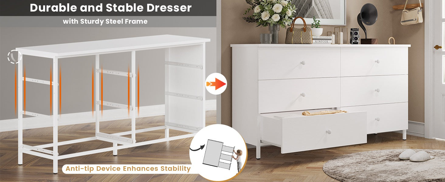 •【Heavy Metal Structure】 Chest of drawers with sturdy heavy metal frame inside, and the outside, and back is completely wrapped by a thickened MDF board, which greatly enhances the robustness and bearing capacity of the dresser. High-quality MDF wood, which is waterproof, anti-scratch, and easy to clean. More Details:1.Each drawer has a metal slide rail that is easy to pull out. 2. Table legs with foot pads to prevent scratching the floor. 3. Anti-fall device protects you and your family.