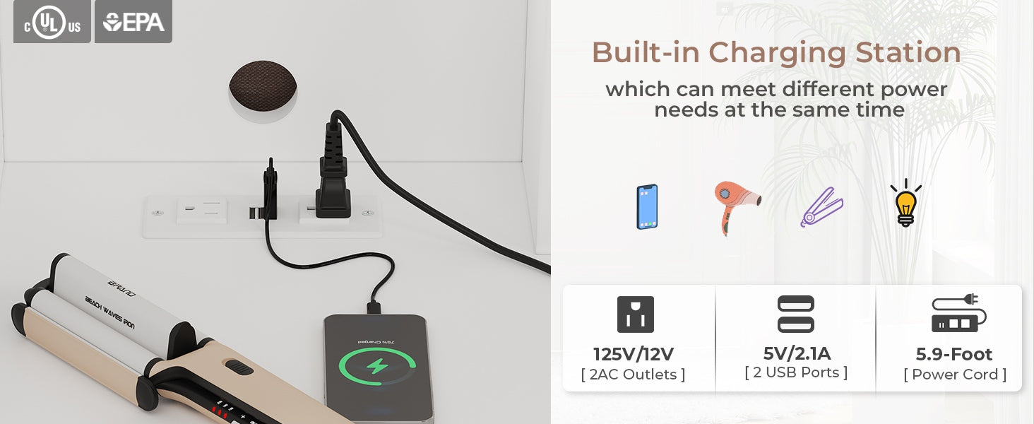 • Built-in Charging Station: 2 AC outlets + 2 USB ports.