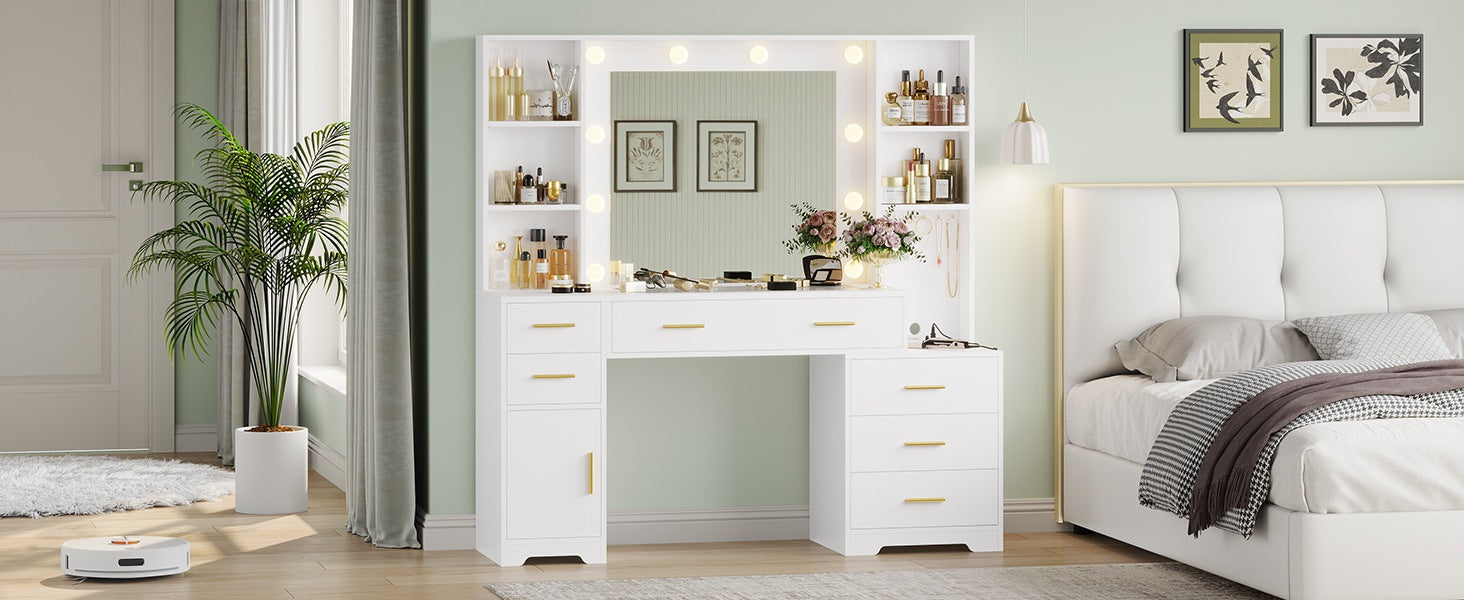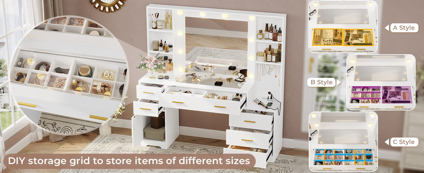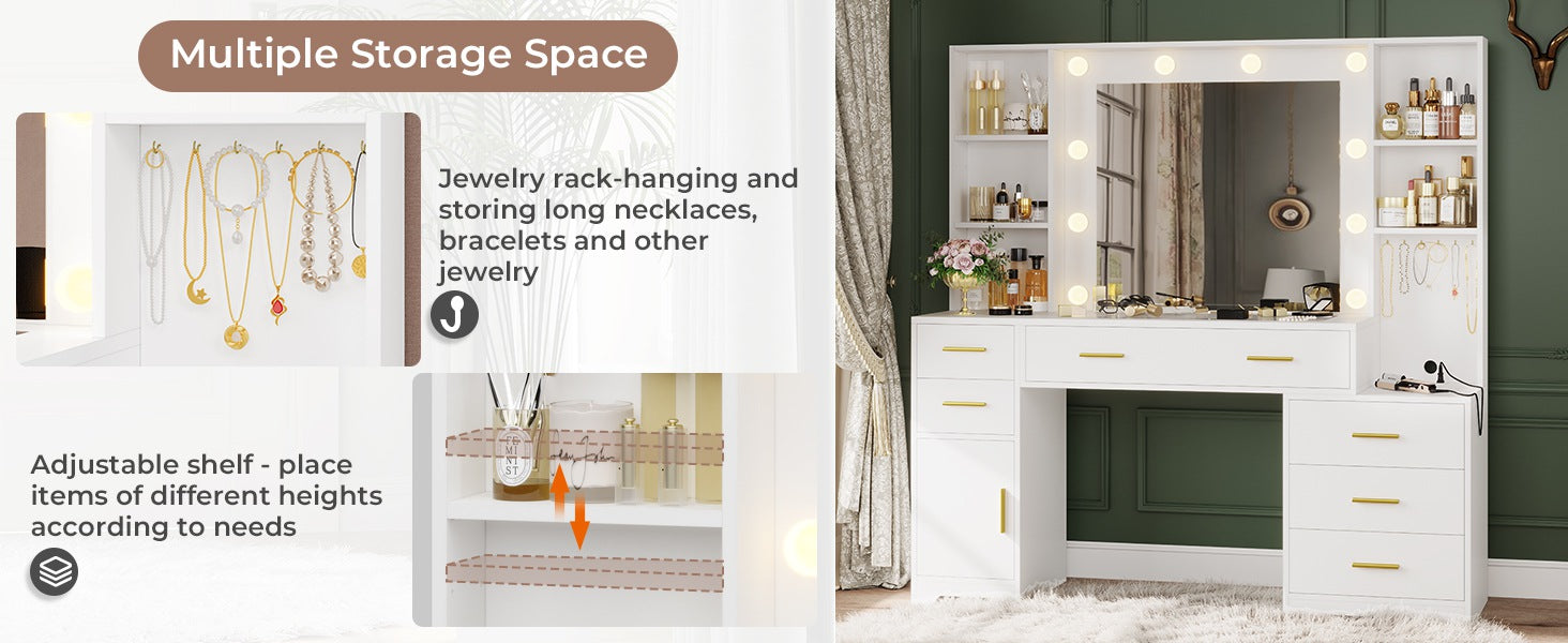 •【Large Vanity with Ample Storage】48.8'' Large dresser comes with enough capacity storage. The spacious tabletop and 4 shelves are enough to hold your frequently used makeup items, 6 hooks can organize your bracelet or necklace and other tangle-prone items. The dressing table has 6 drawers and 1 side cabinet, which is perfectly able to hold all your stuff, the largest glass top drawer, not only can be used for DIY but also allows you to quickly find the makeup or jewelry you want.