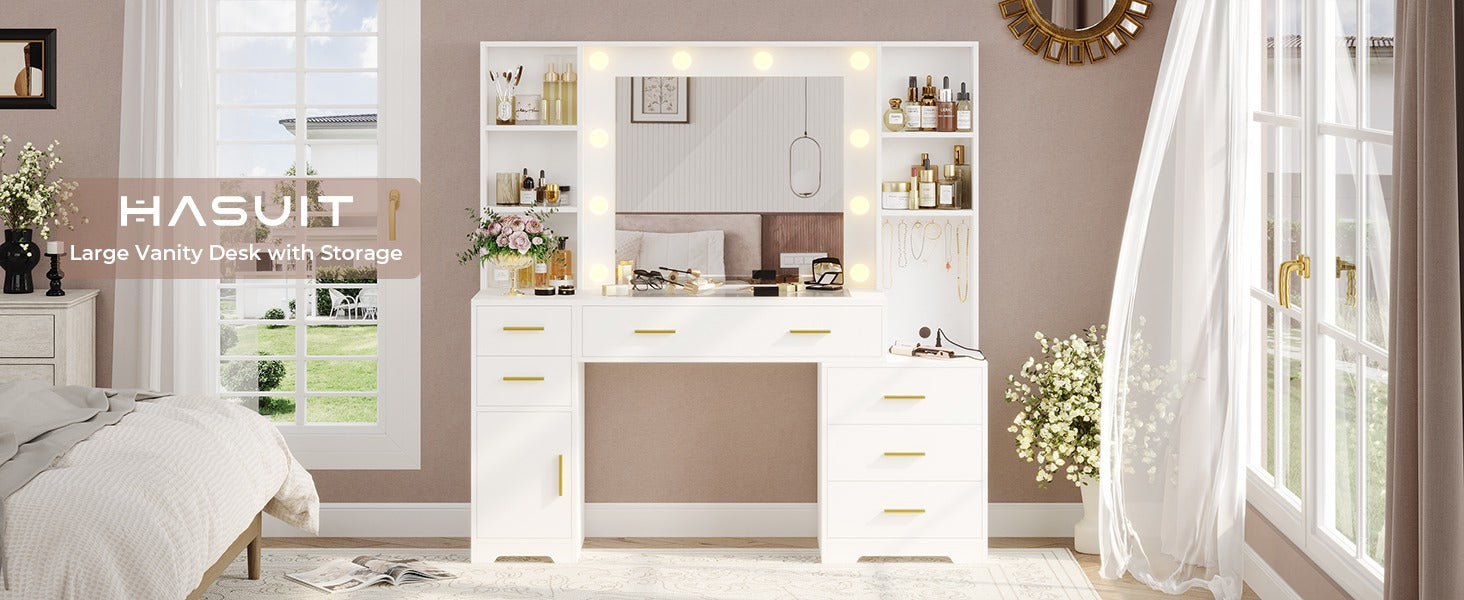 Hasuit | 48.8 Inch Large Vanity Desk with Lighted Mirror & Power Outlet White Makeup Vanity Table with 6 Drawers 4 Shelves and 1 Storage Cabinet