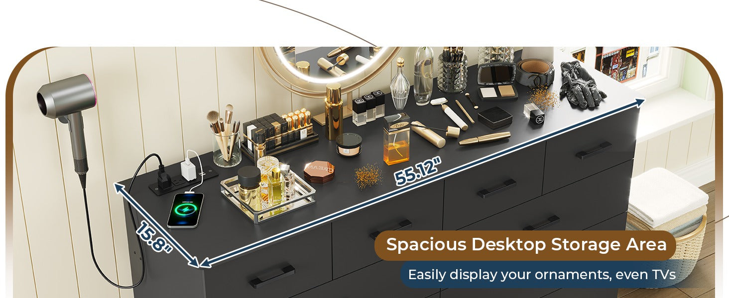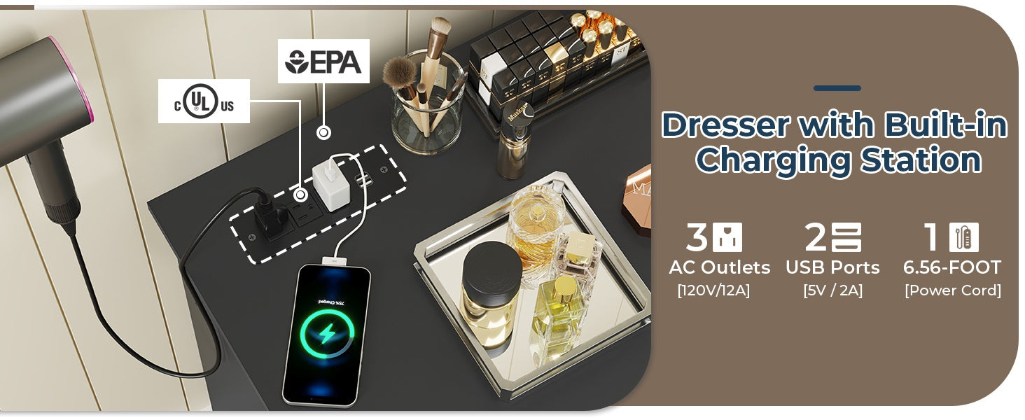 •【Built-in Charging Station】 The power strip is located on the desktop of the dresser, which has 2 AC outlets, 2 USB ports, and a power switch. It is very convenient for powering devices, such as TV, desk lamp, laptop, phone, etc.
