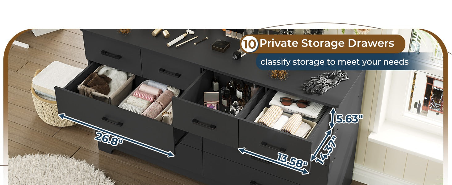 •【Spacious and Multi-functional】 The dresser with 6 large and 4 small drawers provides plenty of different storage space for your more detailed organizing. This classic black modern chest of drawers is suitable for various bedroom styles and layouts. The overall dimension is 55.1 inches (L) * 15.7 inches (D) * 32.3 inches (H).