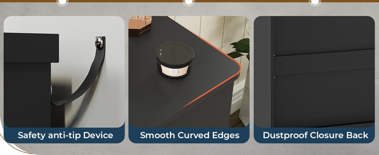 •【Enclosed Backboard】 The innovatively designed back provides the dresser with better seal and dust resistance, as well as improved stability and resistance to swaying. A cable hole on each side ensures that plugs, light strips, or other media cables are well organized.