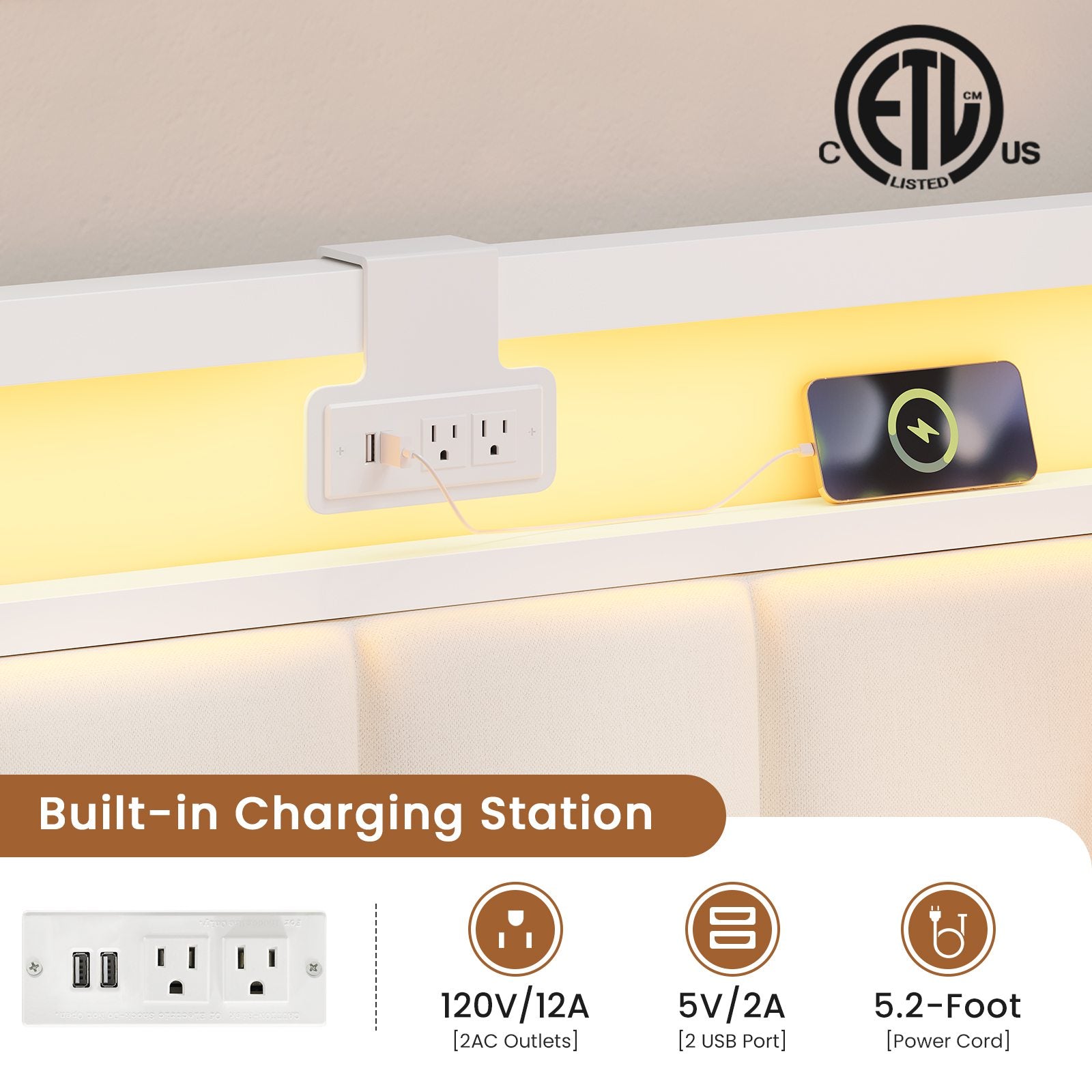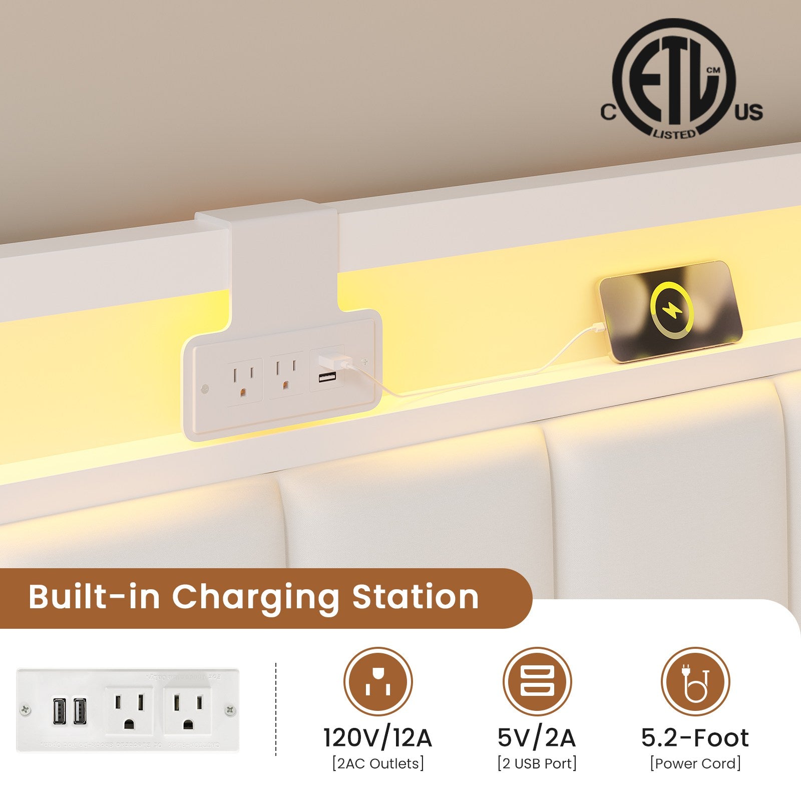 • Charging Station: 2 AC outlets + 2 USB ports for convenient bedside charging.