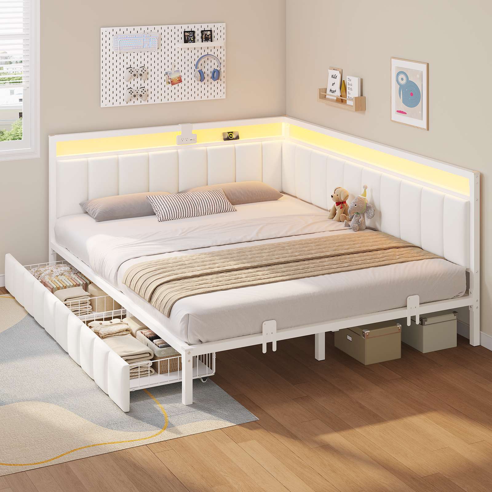 Hasuit | Corner Bed Frame with Storage Drawers Full Daybed with Line Fabric Upholstered Fence Kids Bed Unit with LED Light and Charging Station White