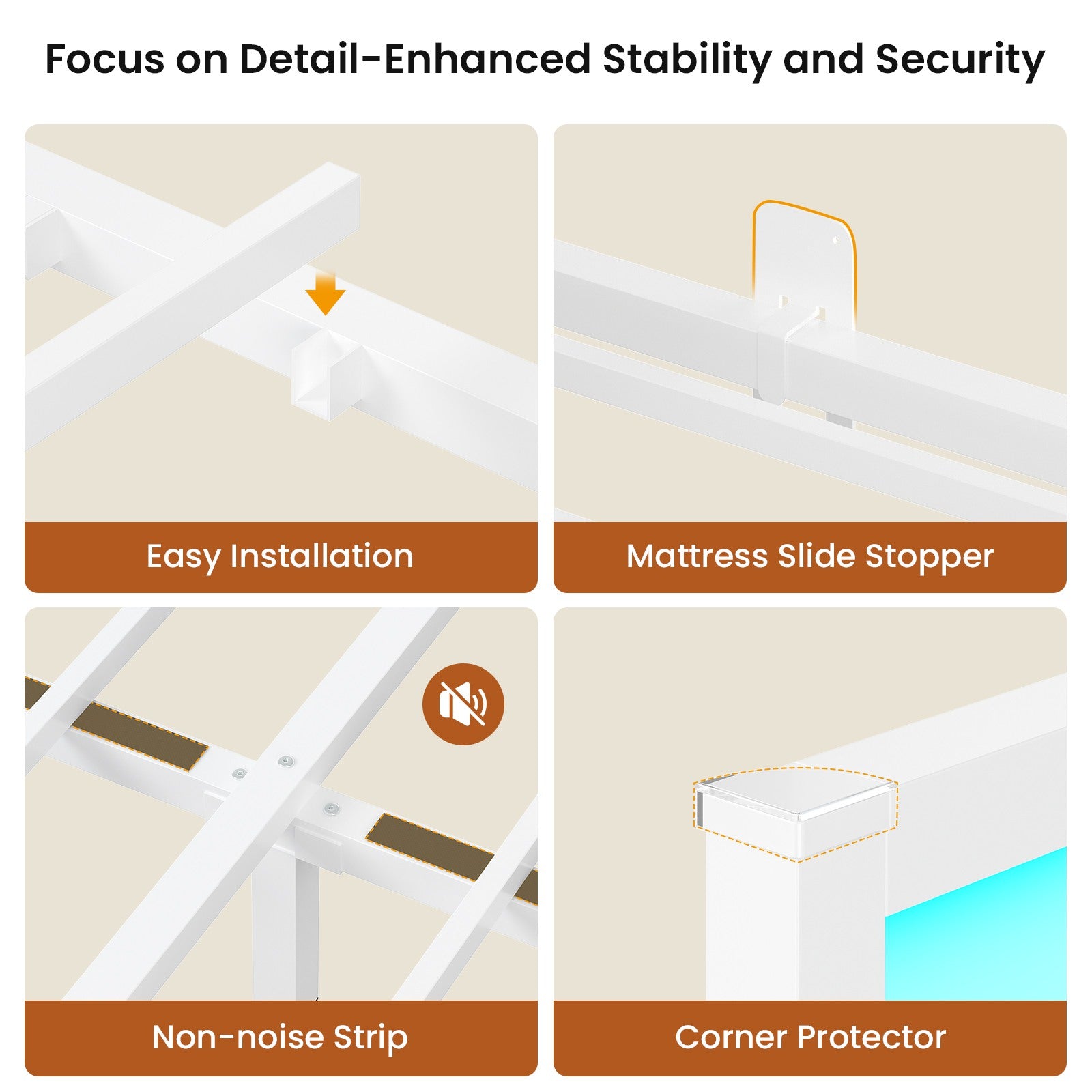 •【Mattress Slide Stopper & Plastic Corner Protectors】 Each bed frame is equipped with 2 mattress slide stoppers, effectively preventing frequent use of the mattress brought about by sliding; 4 exposed bed frame iron corner stickers affixed with plastic corner protectors to reduce the damage caused by bumping.
