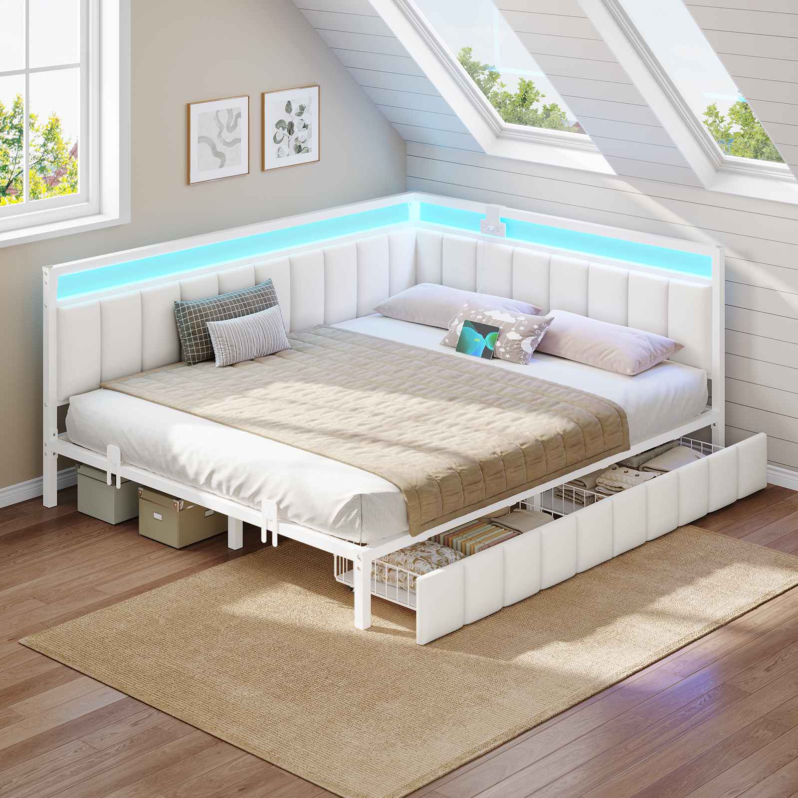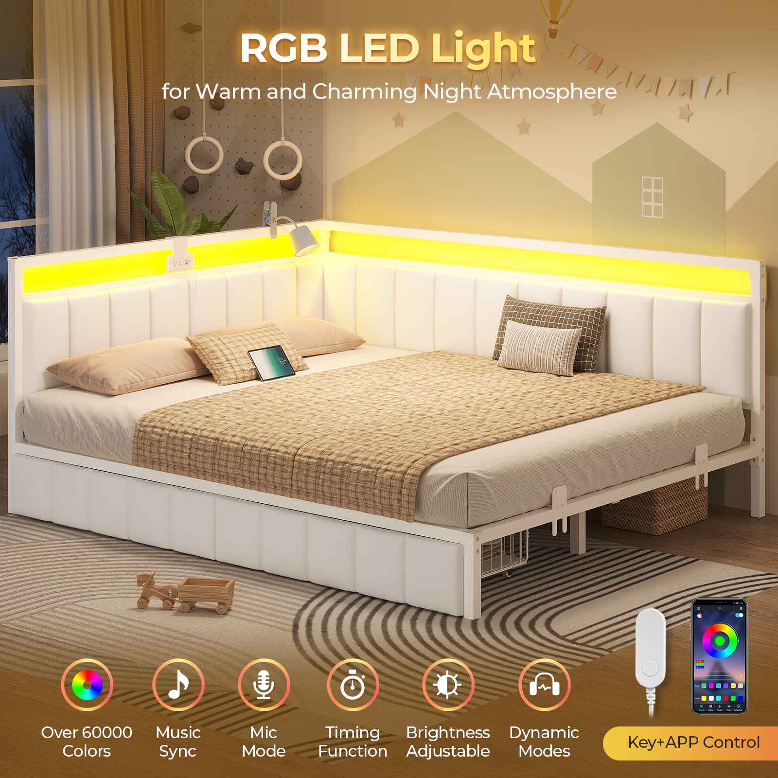 •【Smart LED Lights】The corner bed is equipped with light strips, which have a variety of colors and light patterns to choose from. You can also adjust the light change by APP or key control, In addition to directly adjusting the light in the APP, you can also set the music, voice, and timing modes, to discover more wonderfully!