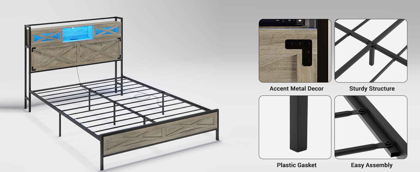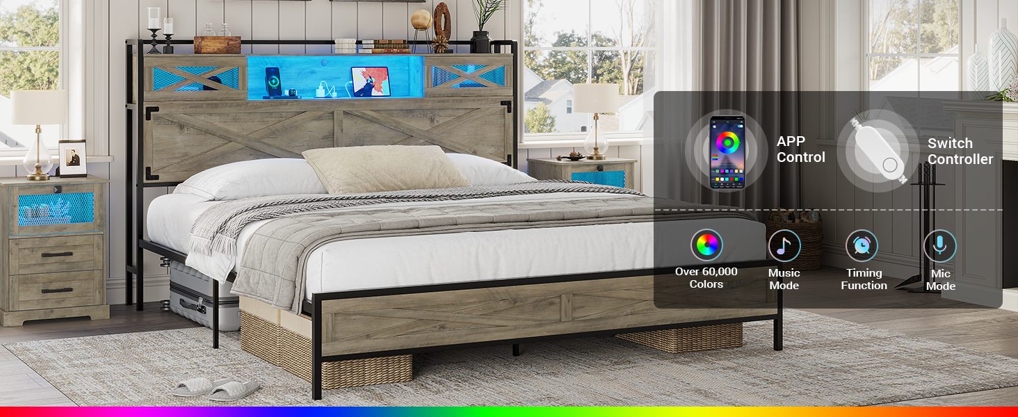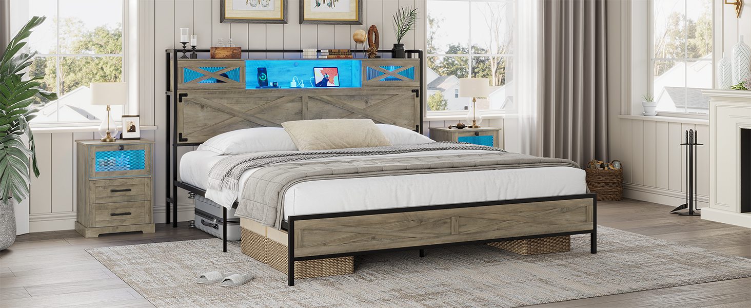 Hasuit Farmhouse Bed Frame With Charging Station and LED Lights