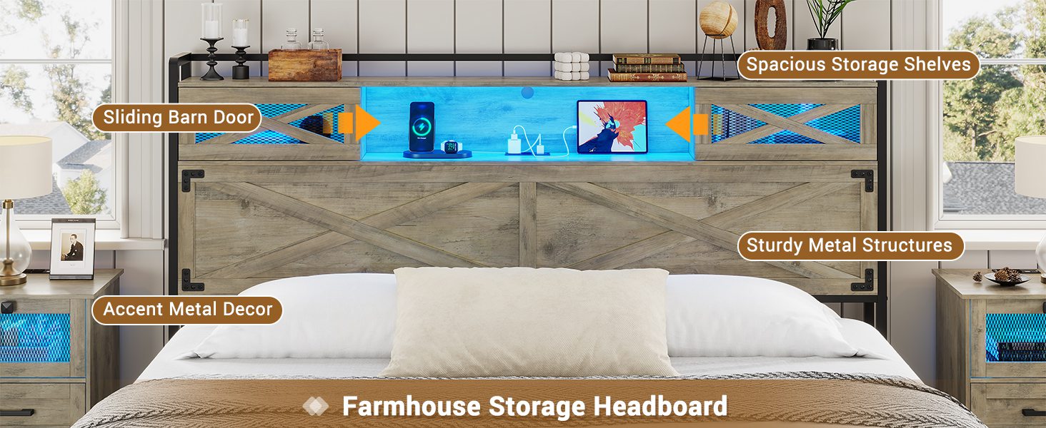 Barn Door Design, Charging Station, Farmhouse Appearance, Headboard Storage, Lighted