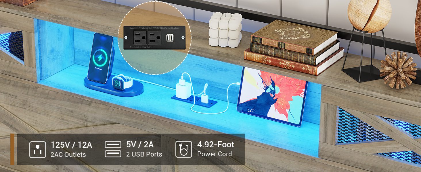 • Built-in Charging Station: Includes 2 AC outlets and 2 USB ports for convenient device charging.