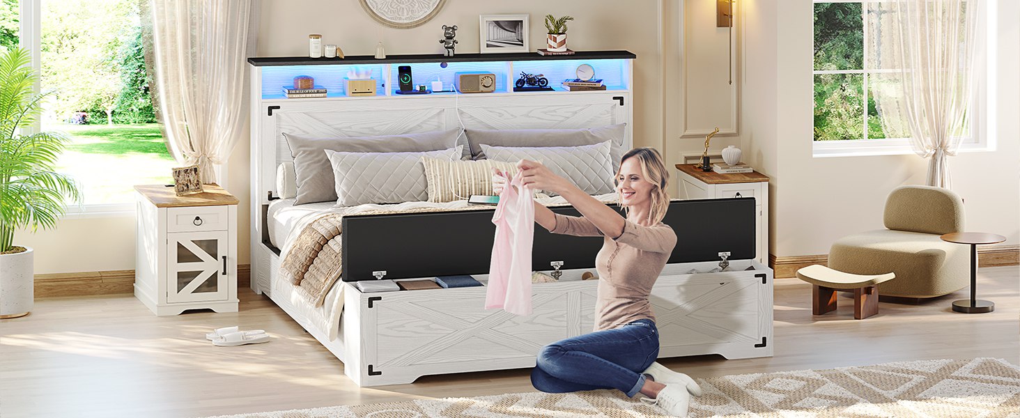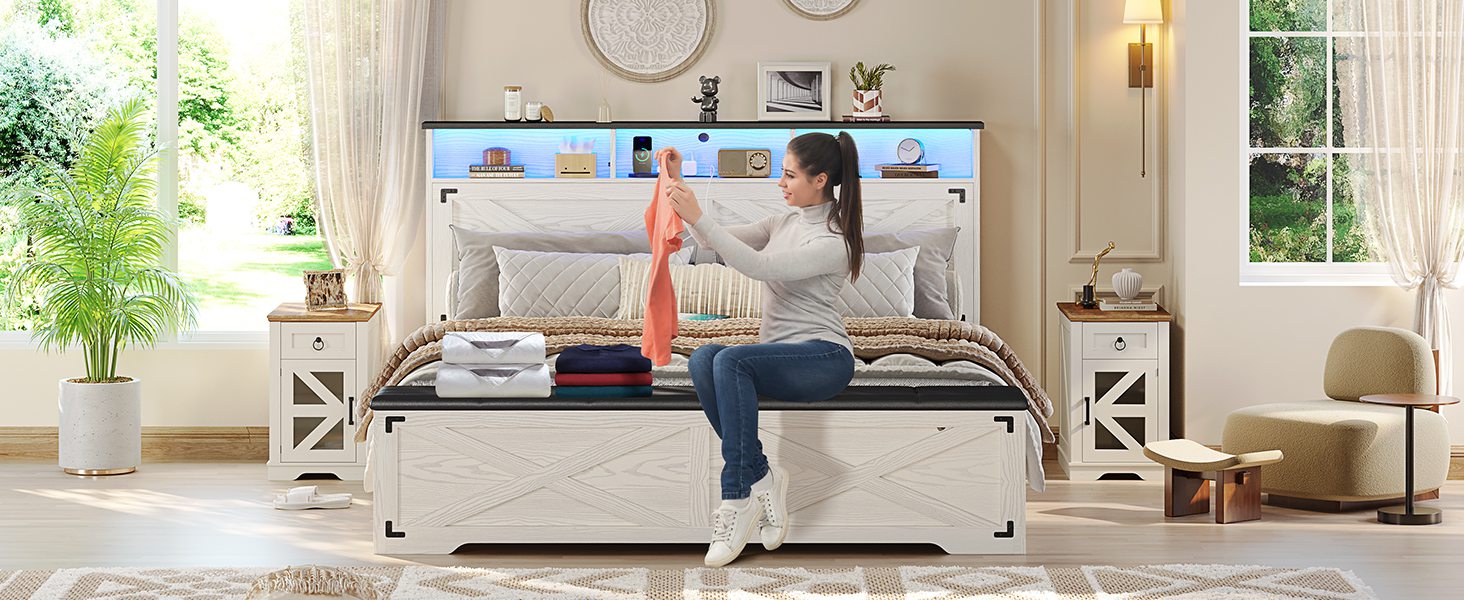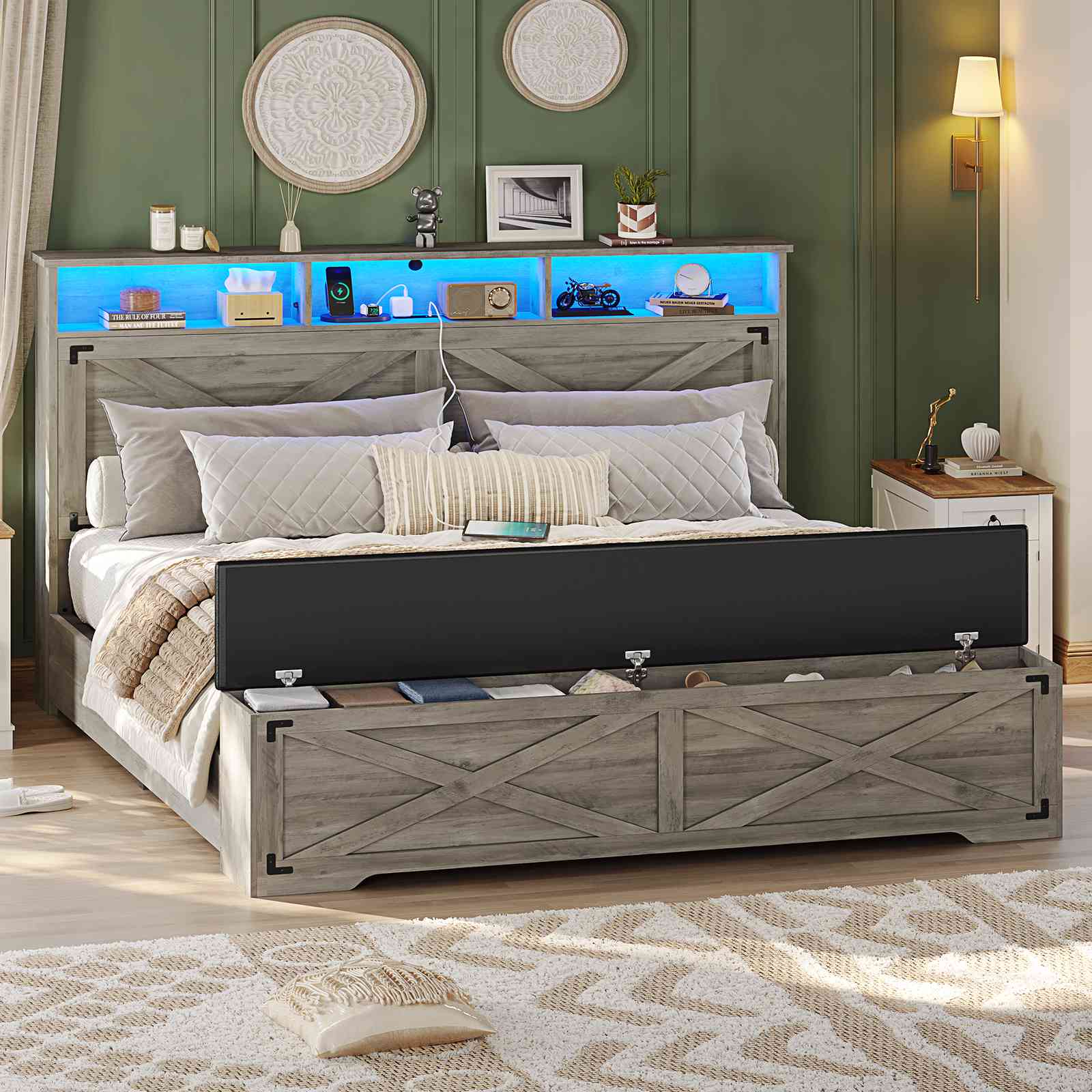 Hasuit | Queen Size Bed Frame with Storage Ottoman Farmhouse Bed Frame with Charging Station and Led Light Headboard with Storage Rack