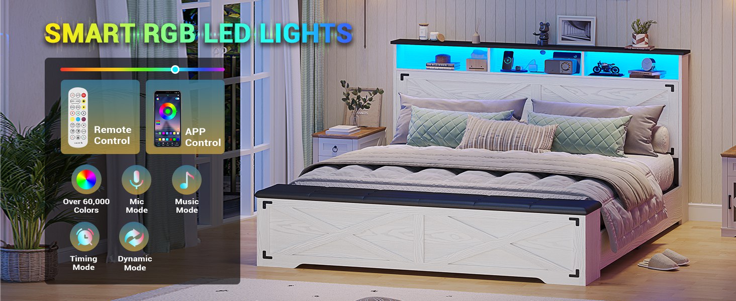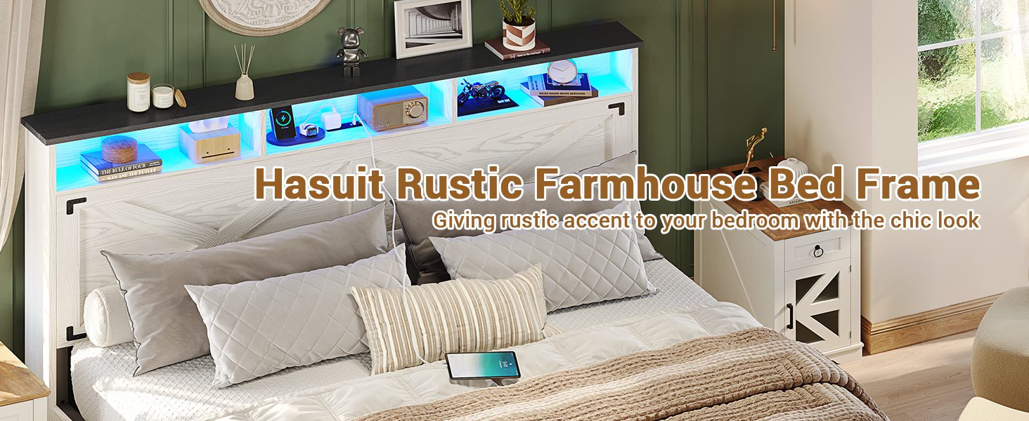 Hasuit armhouse Bed Frame with Lights & Charging Station