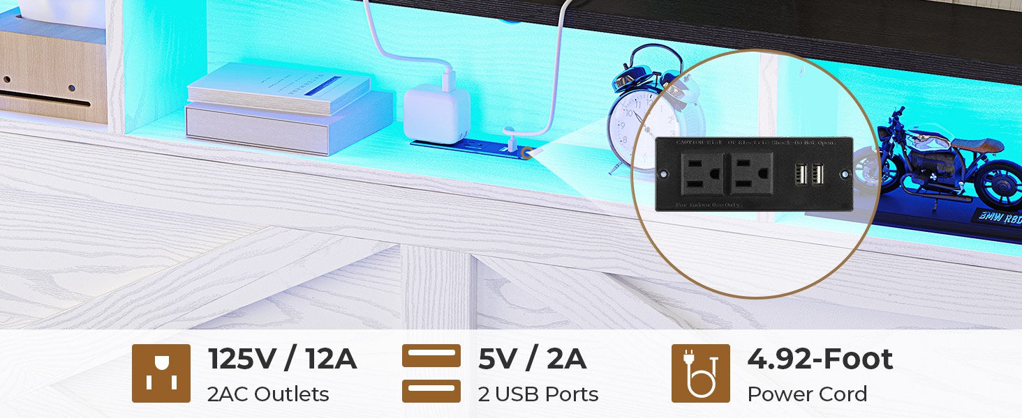 • Charging Station: Headboard includes 2 AC outlets + 2 USB ports; 3 shelves for items.