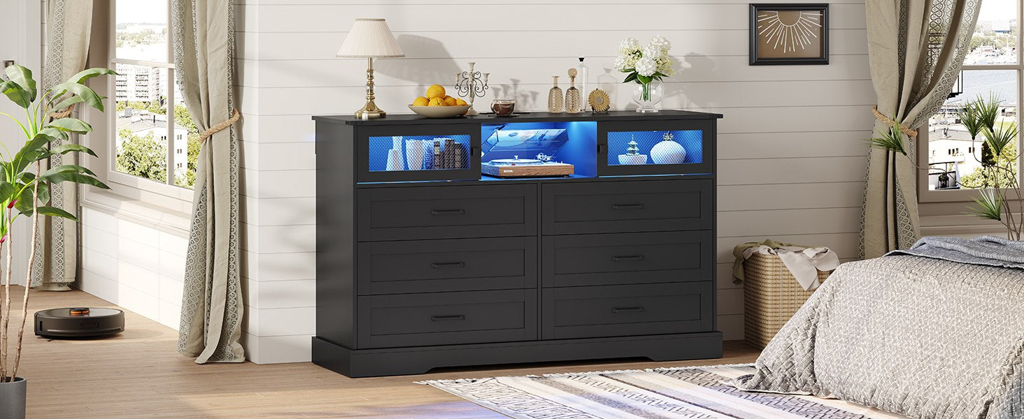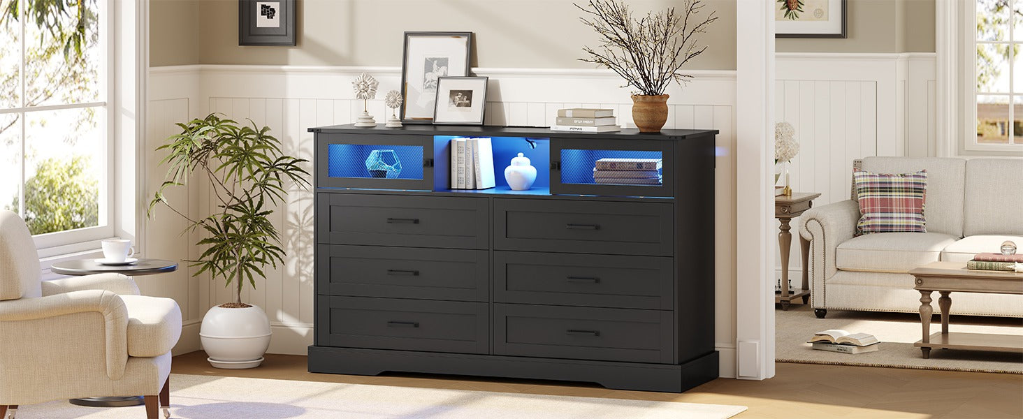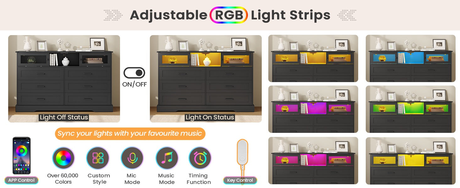 • Smart LED Lights: 6-drawer dresser with hidden light strips; adjustable modes via APP or key control.
