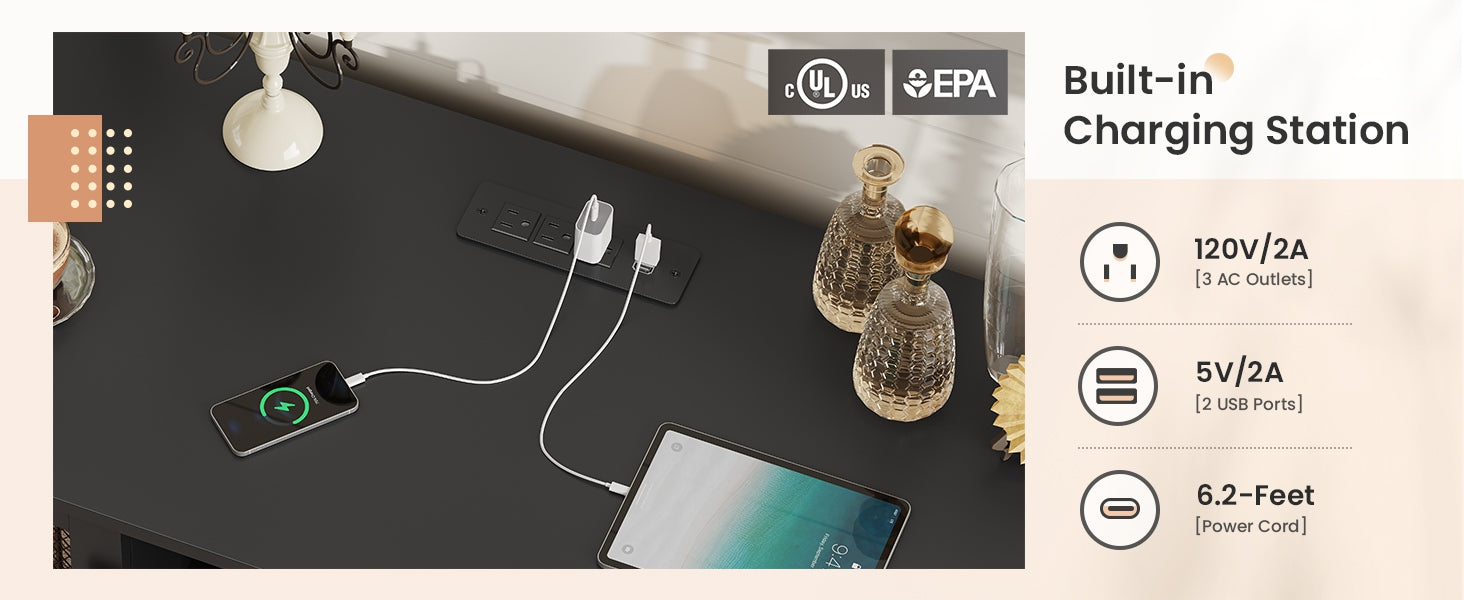 • Built-in Charging Station: Tabletop AC power supply with 3 outlets + 2 USB ports.