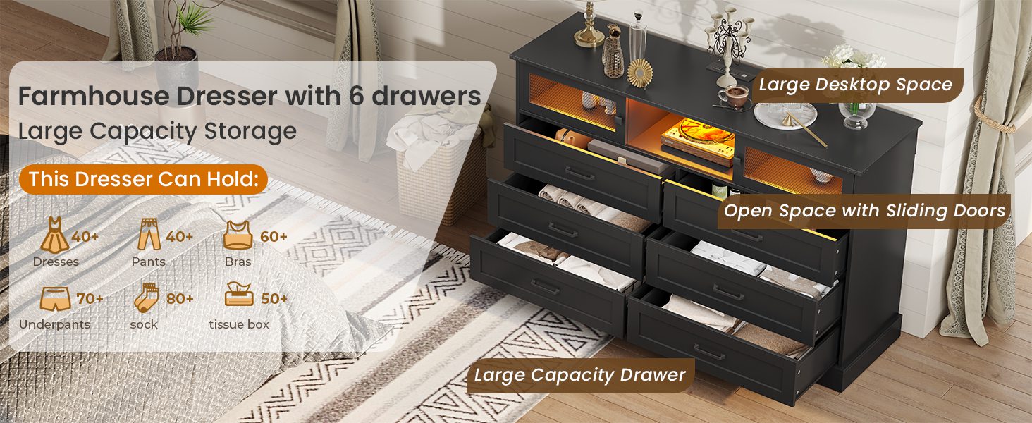 •【Great Storage Solution】The black dresser set features 6 drawers to store clean socks, long suits, jackets, pants, shoes bags boxes, and other accessories. The farmhouse dresser has a storage cubby, which has two small barn-door cabinets at either end, providing extra storage. to keep your room organized.