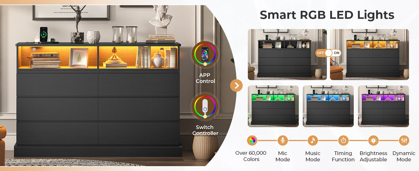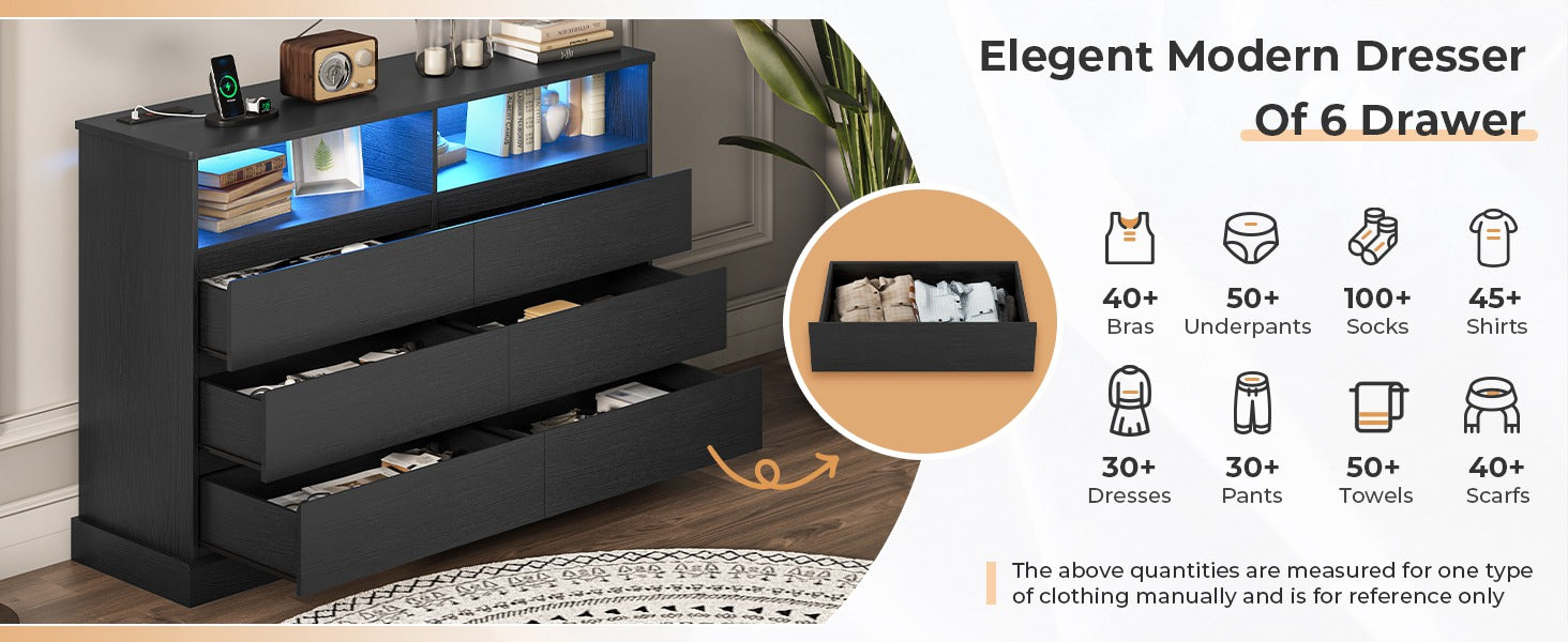 •【Enough Storage Space】LED black dresser with 6 large capacity drawers allows you to store personal items in categories, including clothing, books, cosmetics toys, etc. The 51.2" spacious desktop can double as a dresser TV stand or be used to place photos, lamps, green plants, and other items. Two open storage spaces on the top floors ensure everything you need is within easy reach. The chest of drawers can function in any corner of your bedroom, closet or living room to keep your room clean and tidy.