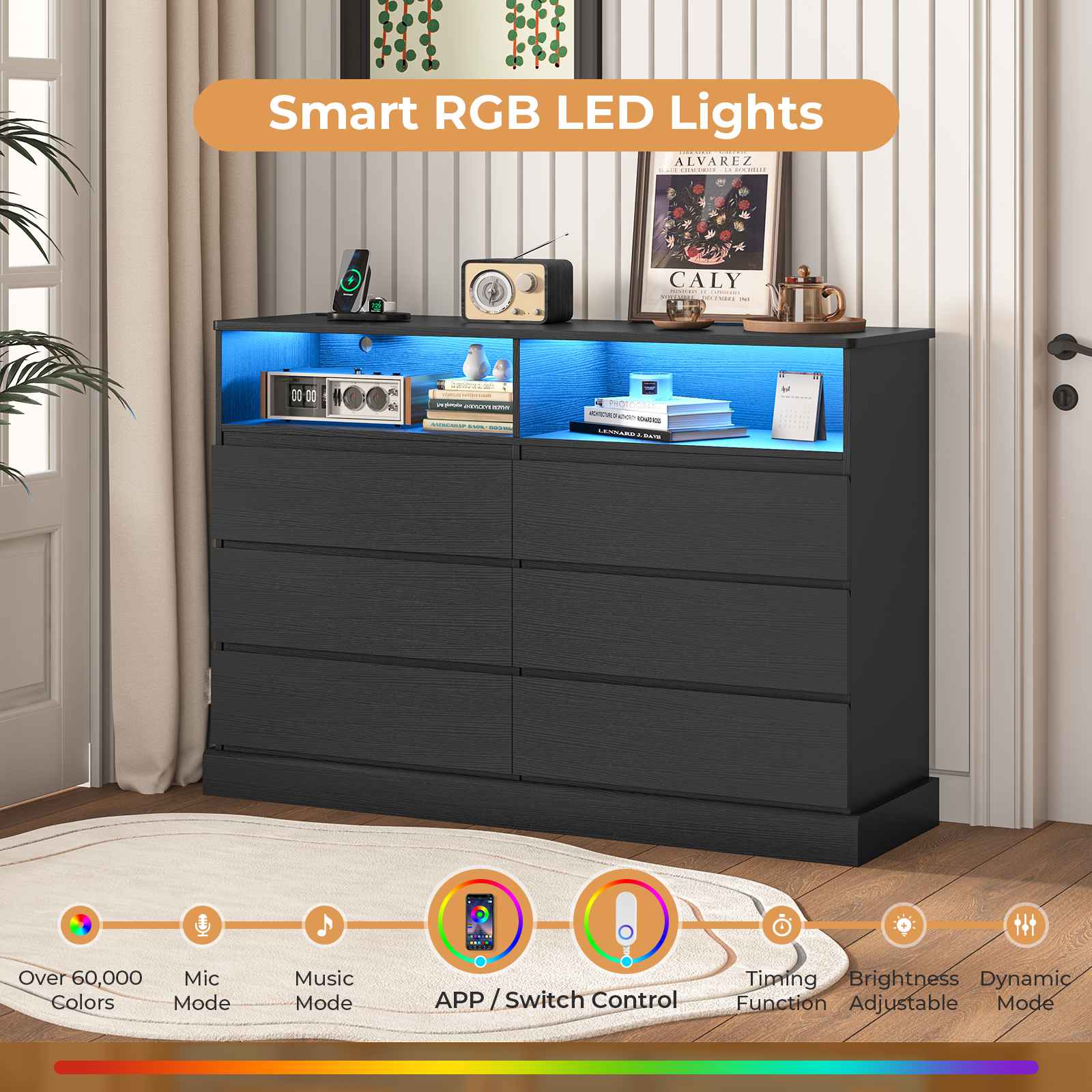•【Dresser with RGB LED Lights】LED lights color adds a modern and stylish flair. It looks prettier in the dark and adds a unique vibe to your bedroom. It can be controlled by button control or APP. It has more than 60,000 colors to choose from, the brightness can be adjusted, and many other modes are waiting for you to explore: custom style mode, music mode, mic mode, and timing function.