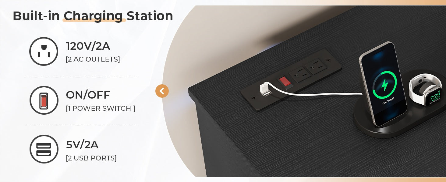• Built-in Charging Station: 2 AC outlets, 2 USB ports, 6.56-ft cord.