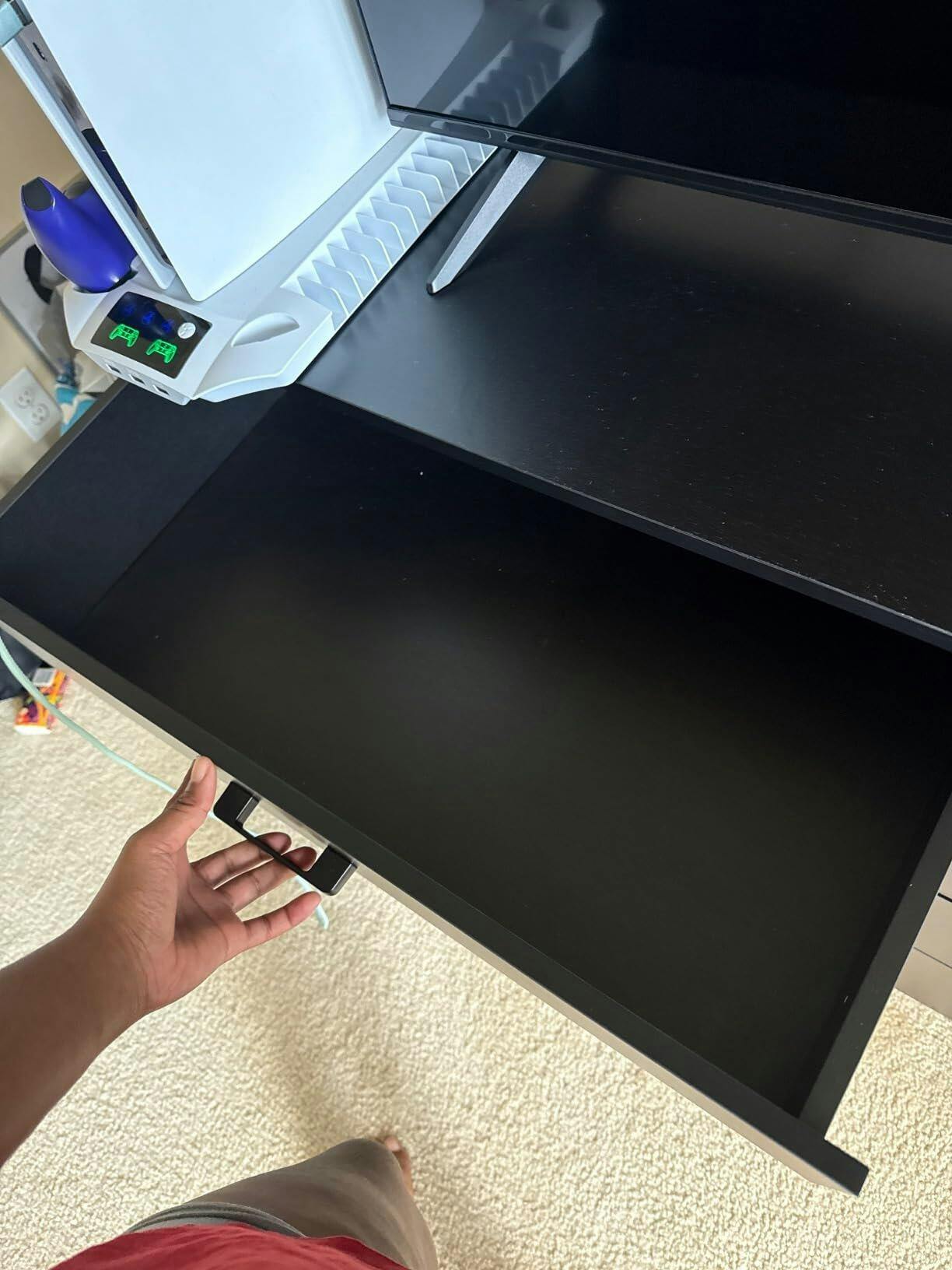 It’s a solid black color with decent sized drawers. Took about 2-3 hours (with a drill). After assembling be sure to watch your drawers (some aren’t fully aligned). The Tv sitting on top is a 50 inch with lots of space on the sides and behind it for other stuff.