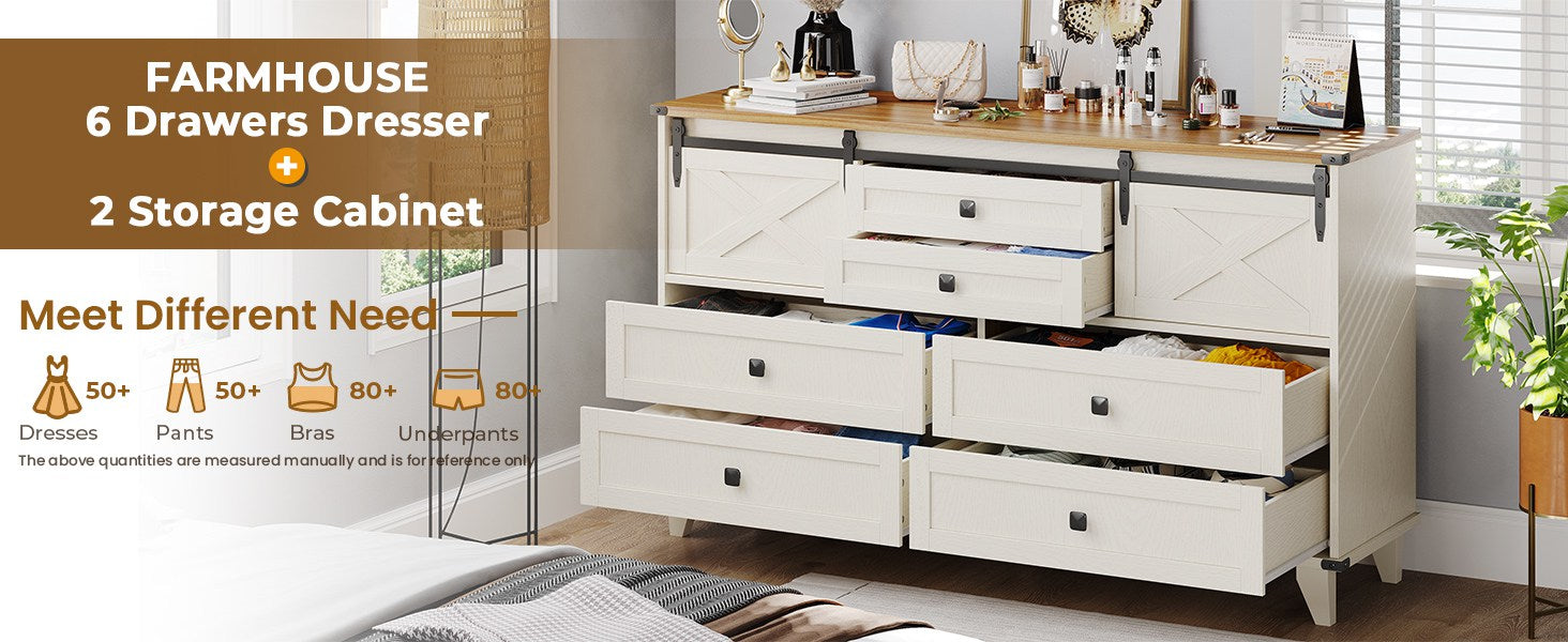 Hasuit | 55.1 Inch Farmhouse 6 Drawer Dresser for Bedroom Retro Chest of Drawers with Sliding Barn Door