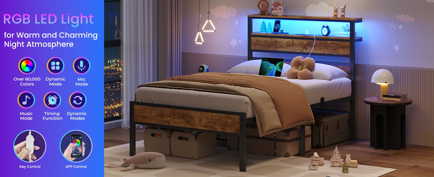 •【LED Bed Frame with RGB Lights】With a mobile app or button control, you can explore over 60,000 colors and customize brightness, color, mode, and timer settings to suit your preferences. Convenient to change the light when you are lying on the bed, create a romantic or dynamic atmosphere in your bedroom.