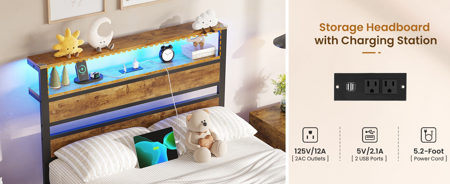 • Storage Headboard with Charging: 2-tier shelves + built-in power strip (2 AC, 2 USB) for easy charging.