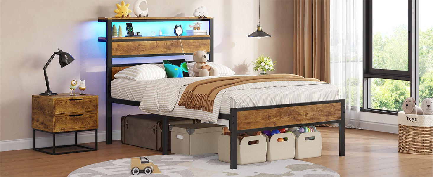 •【Practical Storage Headboard with Charging Station】 This twin bed frame comes with 2 tier storage shelves on the headboard that is perfect for storing small items like books, lamps, alarm clocks, glasses, etc. Built-in power strip with 2 outlets and 2 USB ports, it is very convenient for you to charge your electronics and use light to read within easy reach. No worry about the low battery, especially when your room has limited outlets.