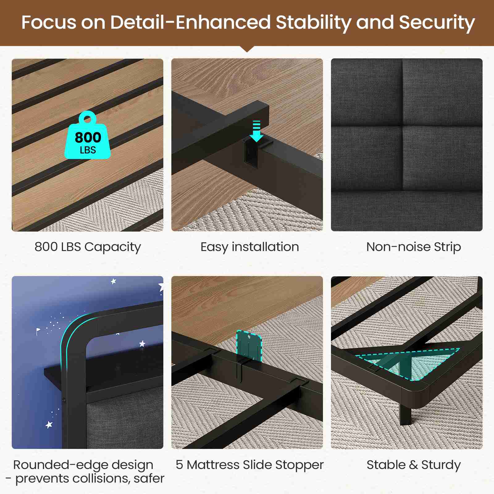 •【Thoughtful Design】Curved collision prevention design ensures safety. Wrapped with linen fabric, the Gray Upholstered headboard offers ultimate backrest experience. In addition, the barrier cloth prevents the pillow from falling, providing you with a more comfortable experience.