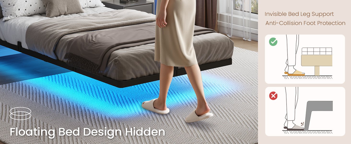 • Floating Design: Hidden leg structure with elevated collision-safe frame (Twin/Full sizes available).