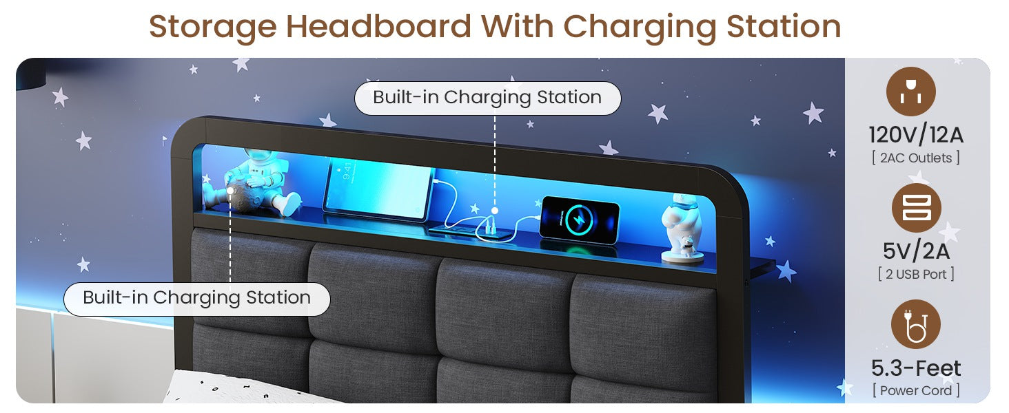 •【Storage Headboard with Charging Station】2 AC outlets and 2 USB ports, making it easy to enjoy the convenience of instant charging at your bedside. Spacious space can place commonly used items such as books, phones, alarm clocks, etc.