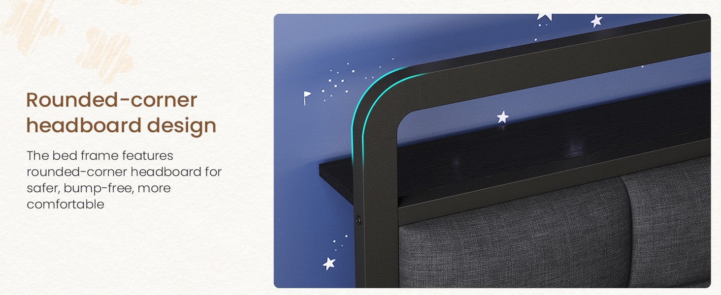 • Ergonomic Design: Gray upholstered headboard with curved edges.