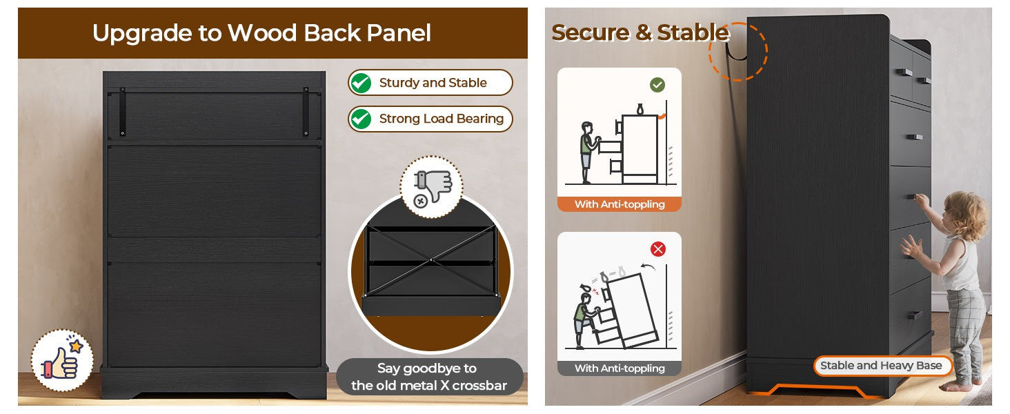•【Quality Assurance】Tall 6 drawer chest is constructed of a solid MDF wooden frame, which has a strong load-bearing capacity and is sturdy and durable. Each drawer is fitted with smooth slide rails that are easy to pull out, and the anti-fall device on the back ensures overall stability and safety. At the same time, we updated the back panel structure to increase stability and closure.