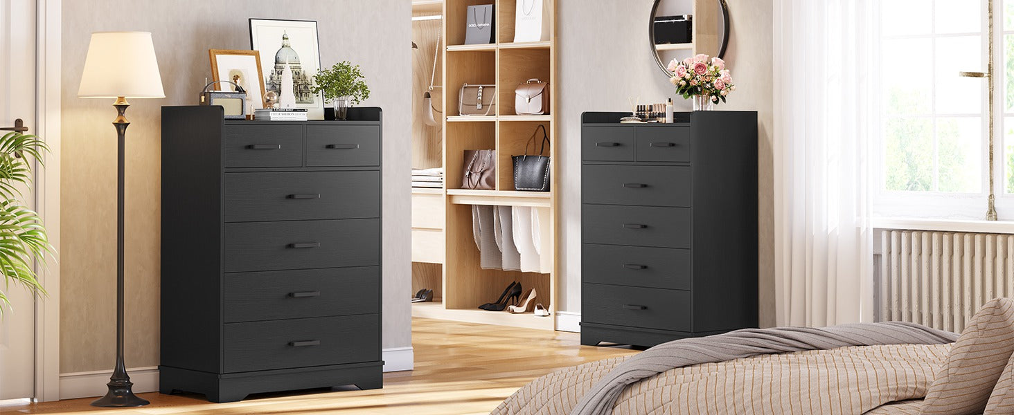 • Clutter-Free Storage: Vertical 6-drawer dresser with split storage design and large tabletop; overall size 26.6"×14.6"×41.3".