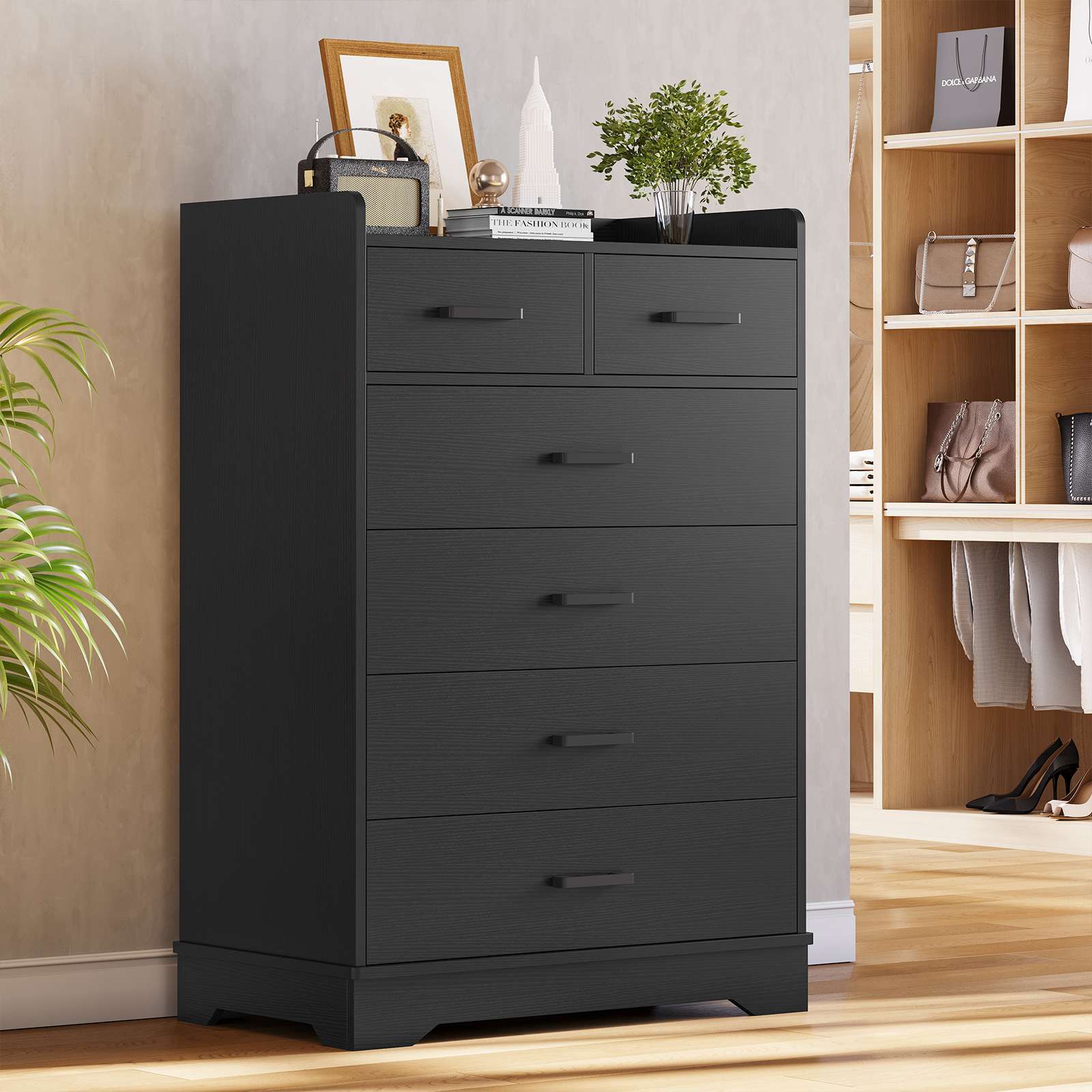 •【Quality Assurance】Tall 6 drawer chest is constructed of a solid MDF wooden frame, which has a strong load-bearing capacity and is sturdy and durable. Each drawer is fitted with smooth slide rails that are easy to pull out, and the anti-fall device on the back ensures overall stability and safety. At the same time, we updated the back panel structure to increase stability and closure.