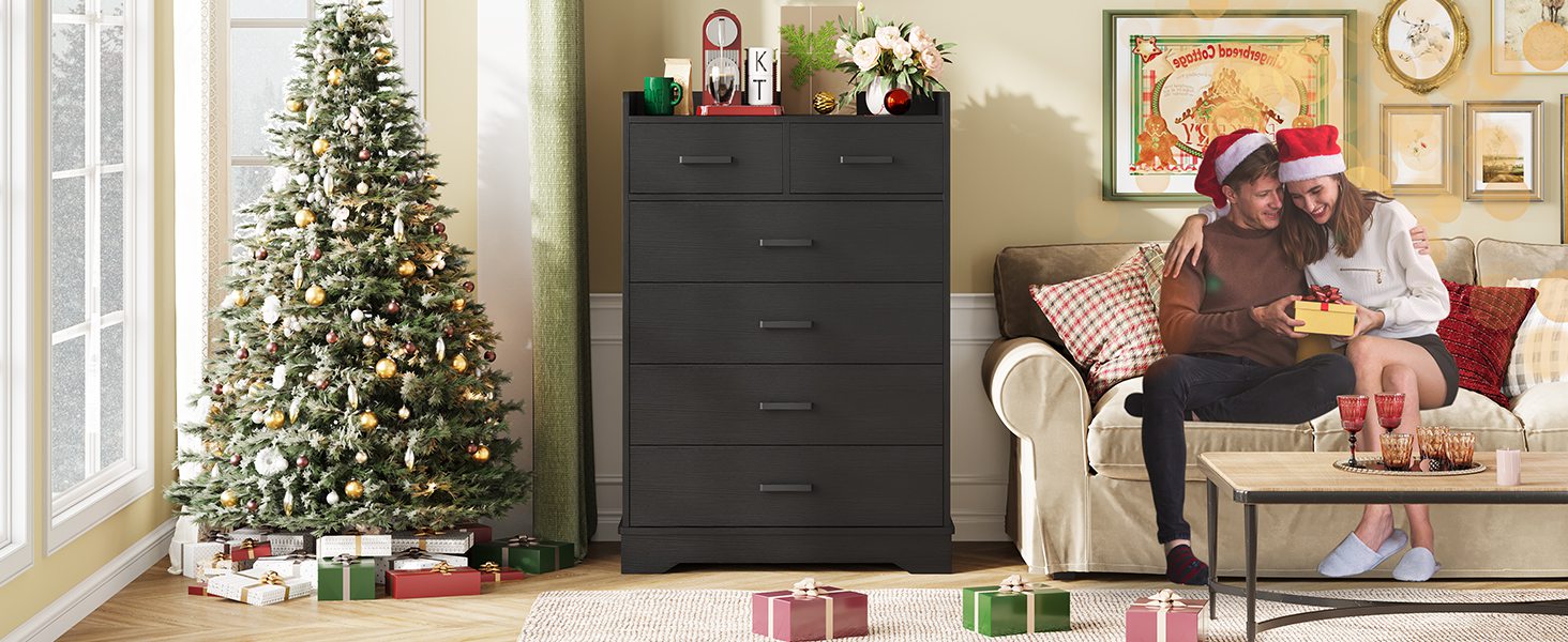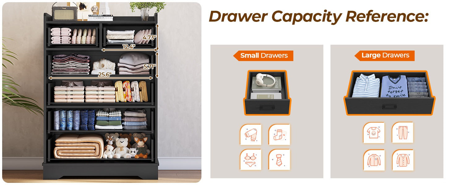 • Clutter-Free Storage: Vertical 6-drawer dresser with split storage design and large tabletop; overall size 26.6"×14.6"×41.3".