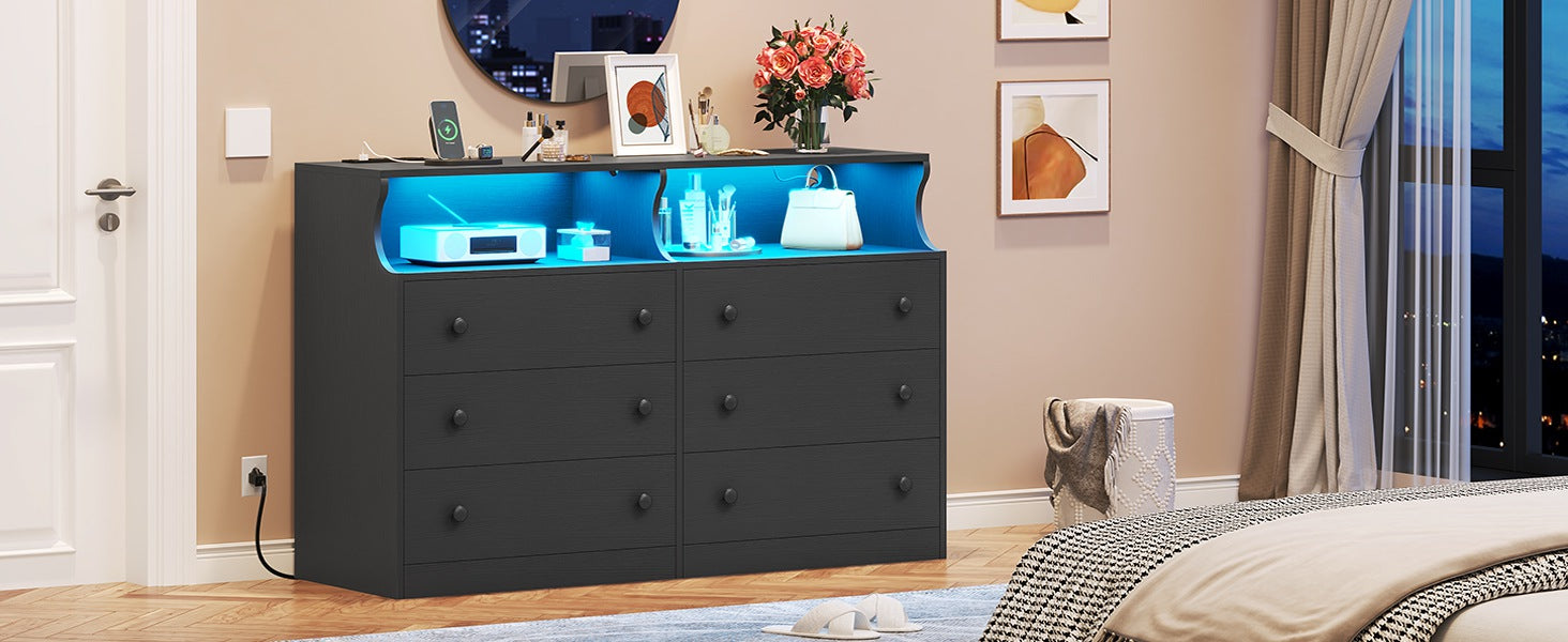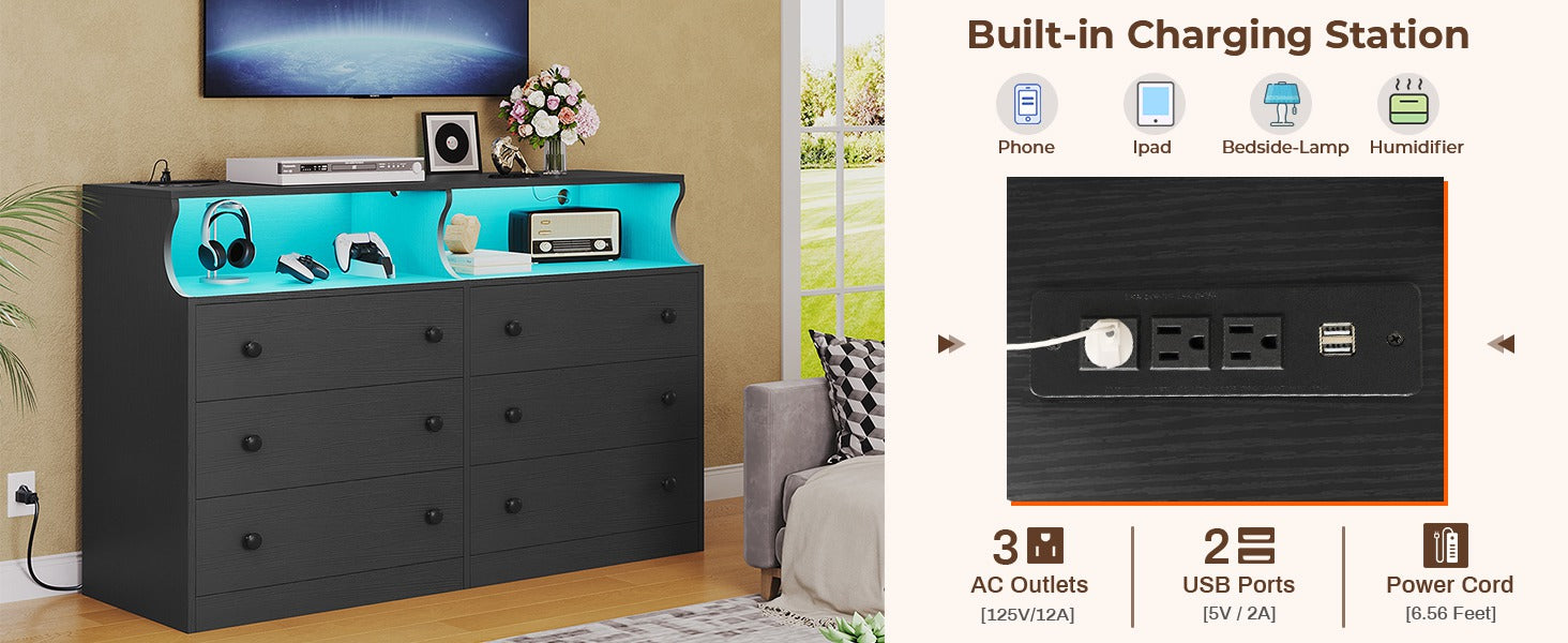It offers plenty of storage with six large drawers and a convenient open shelf on top. The LED lights are fun and easy to control, and the built-in USB ports and outlets are extremely useful for charging devices without clutter. Solid MDF construction and anti-fall device make it feel very durable.