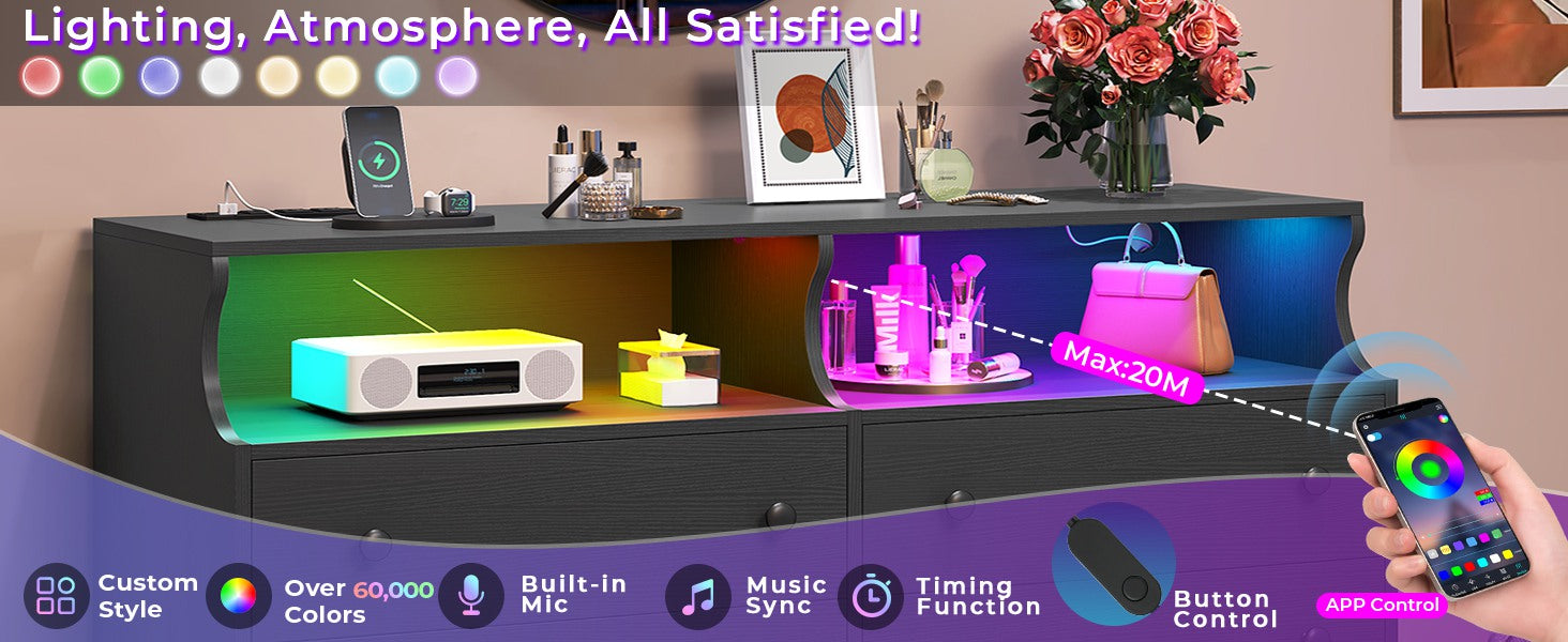 •【Dresser with RGB LED Lights】LED lights make the drawer dresser look prettier in the dark and add a unique vibe to your bedroom. The LED lights can be controlled by button control or APP. It has more than 60,000 colors to choose from, the brightness can be adjusted, and many other modes are waiting for you to explore: custom style mode, music mode, mic mode, and timing function.