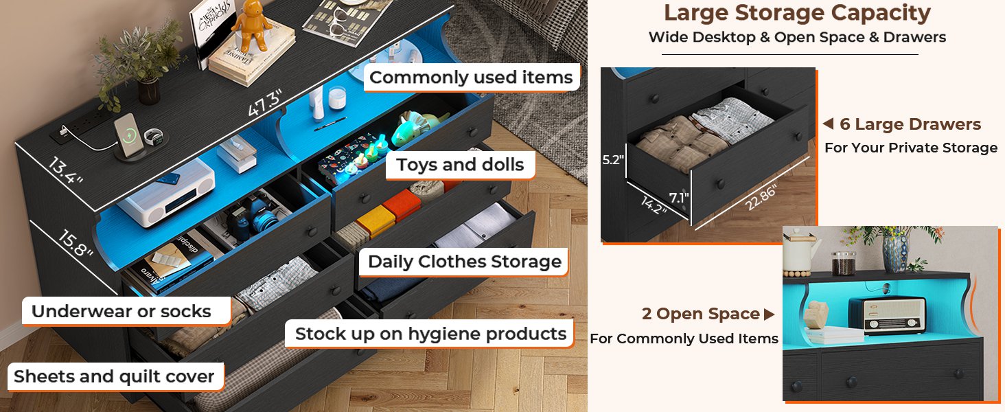 •【Storage to Get Rid of Clutter】LED wooden drawer dresser has 6 spacious private storage drawers, which can store your clothes, toys, books, or any other personal items. The top layer open storage shelf and large desktop can be used to display or store your frames, vases, books, or other decorations. Making it easier for you to sort and store clutter! Overall measures 47.3" (W) x 15.8" (D) x 31.5" (H).