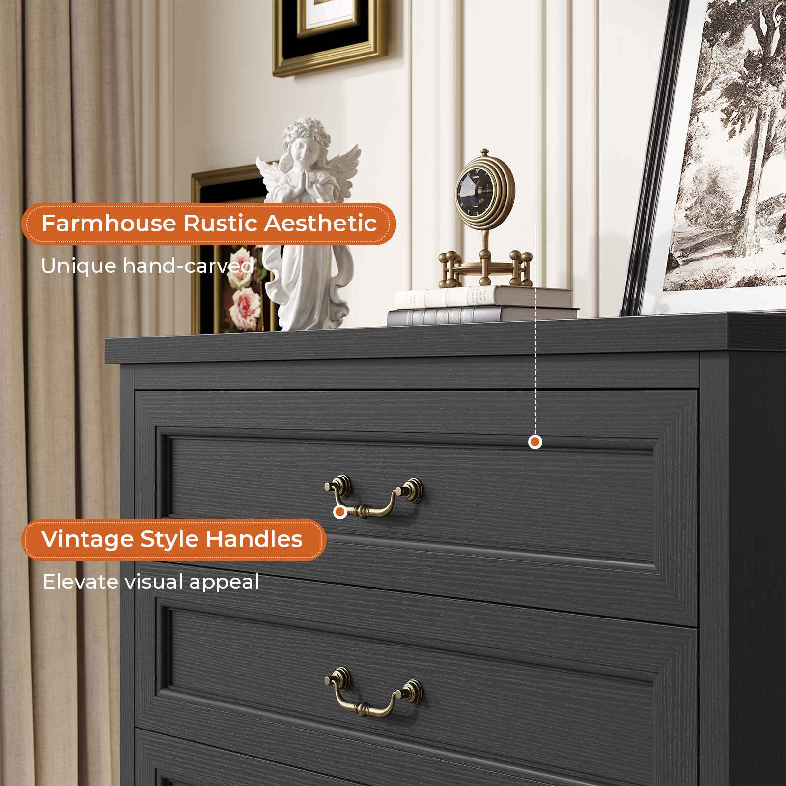•【Farmhouse Vintage Storage Solution】Hasuit tall dresser for bedroom features rustic wood grain、crafted framed drawer fronts that enhance the texture and visual depth of the space. Intricate joinery and vintage style handle are full of farmhouse, add a touch of country charm to your living space, classic shape can easily adapt to any decoration style. Please note: Due to different ambient light conditions, the dresser may have slight color difference.