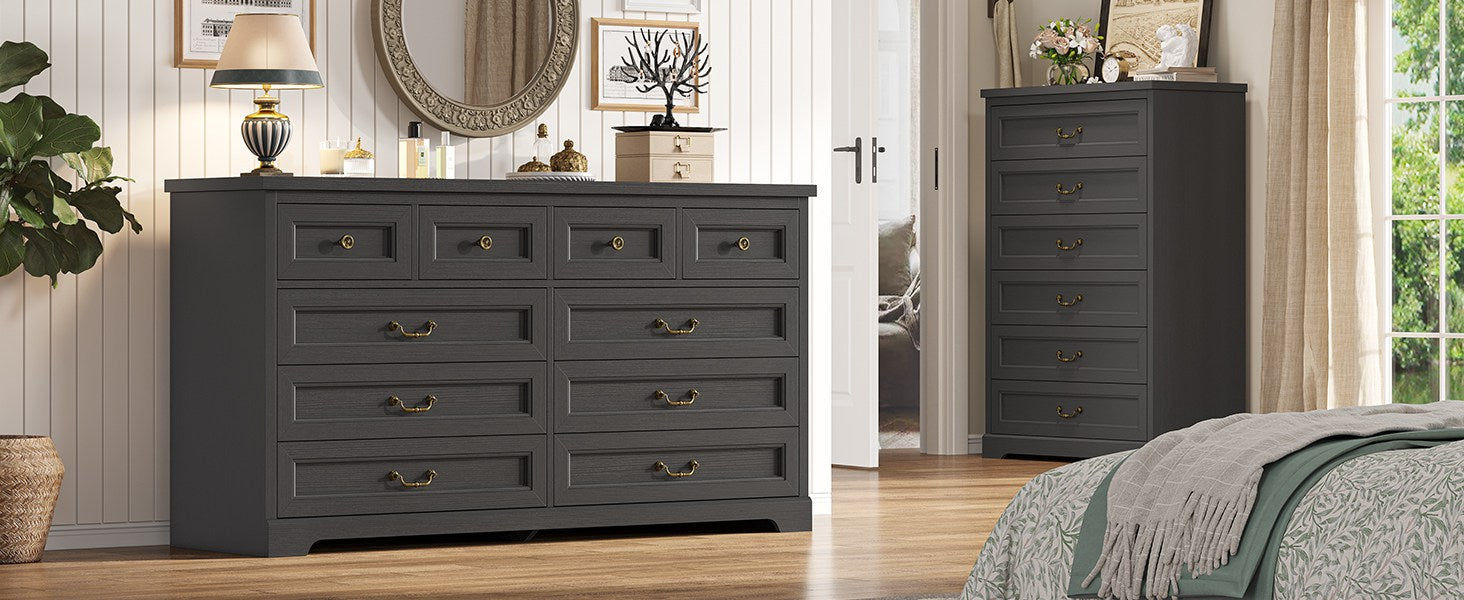 •【Heavy and Sturdy Dresser】The grey bedroom dresser is made of high-quality MDF engineered wood. Thickened top and side panels enhance stability and durability while being scratch-resistant, waterproof and easy to clean. Each drawer is equipped with high-quality metal slides for easy access. An anti-tip kit is included to ensure the safety of you and your family. The stable base design makes the dresser less likely to shake, and there are support legs in the middle to ensure weight bearing.