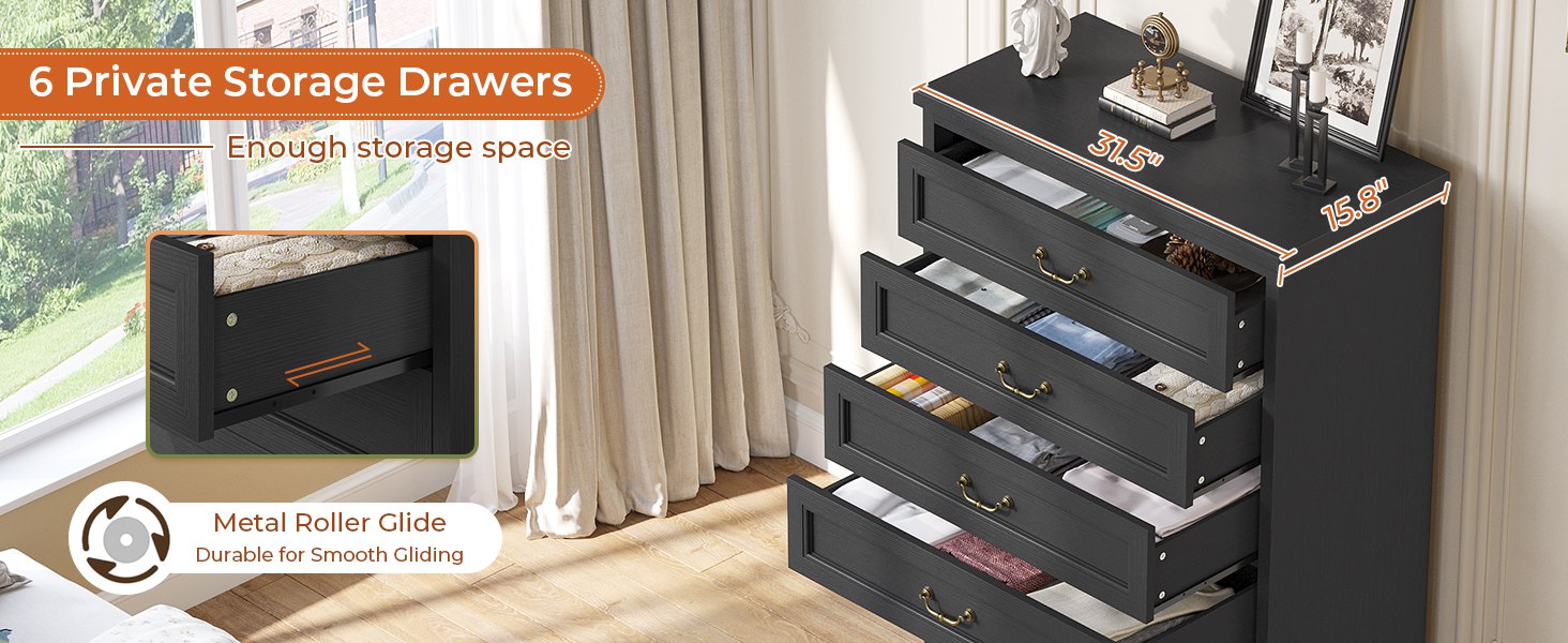 •【To Serve You Better】Your 6 drawers dresser will be safely packed in a box with protective foam to ensure maximum protection against shipping damage. It require self-assembly, and the package contains detailed instructions and accessories, tools, and all parts are labeled one by one. If you have any questions or concerns about our products before or after purchase, please feel free to contact us, we are always at your service.
