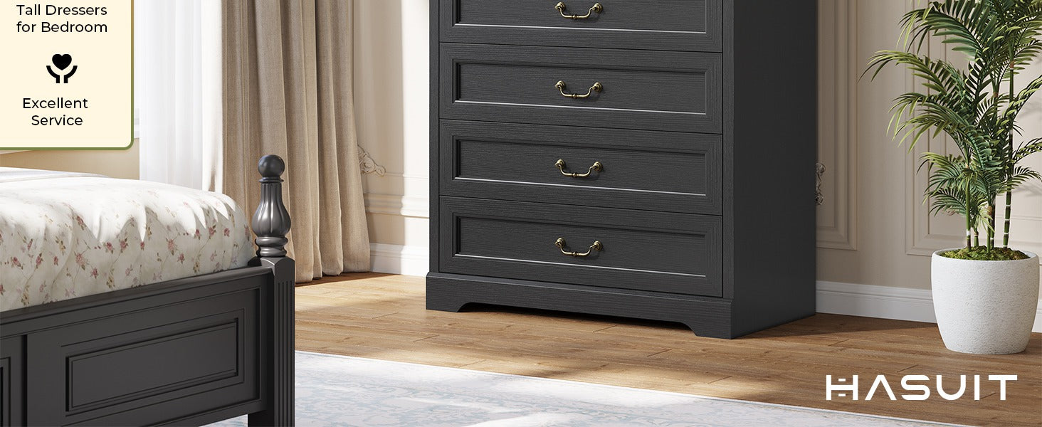 •【Farmhouse Vintage Storage Solution】Hasuit tall dresser for bedroom features rustic wood grain、crafted framed drawer fronts that enhance the texture and visual depth of the space. Intricate joinery and vintage style handle are full of farmhouse, add a touch of country charm to your living space, classic shape can easily adapt to any decoration style. Please note: Due to different ambient light conditions, the dresser may have slight color difference.