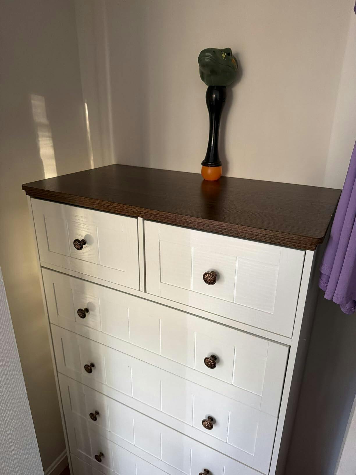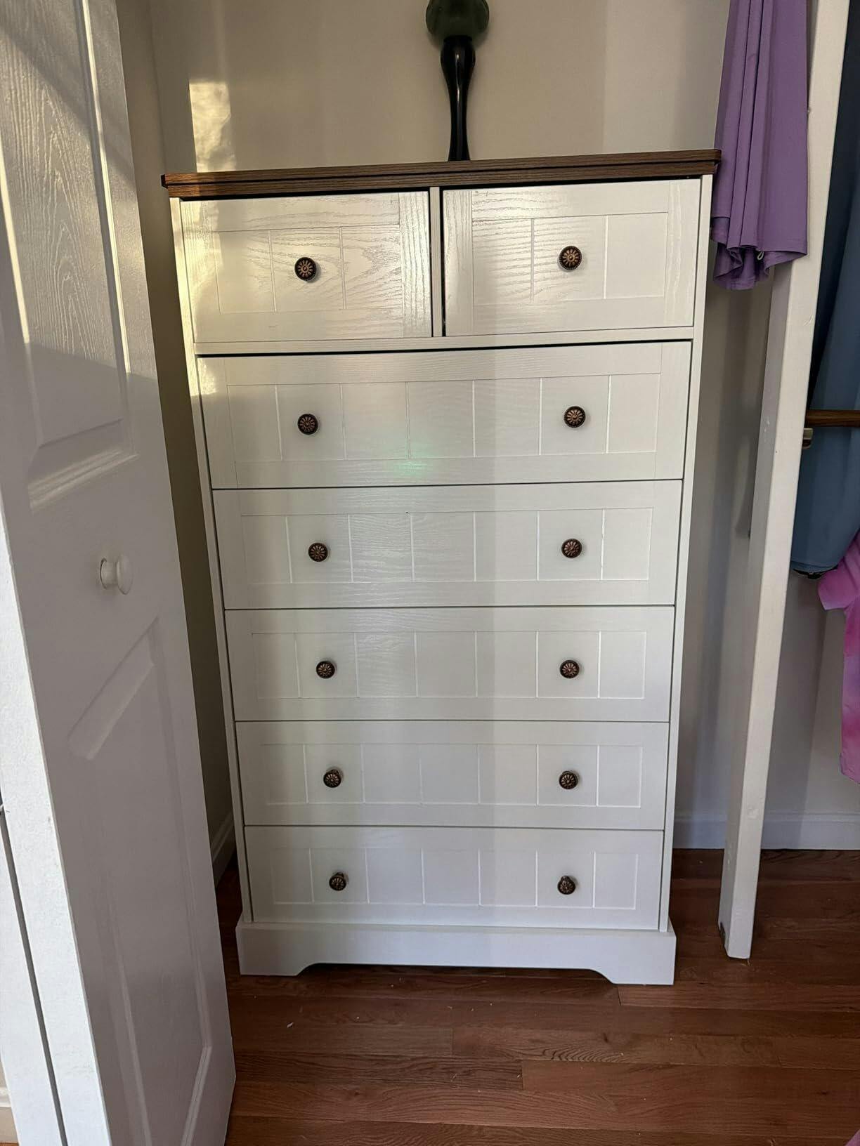 Great dresser! We had a open space in our daughter's closet that needed a storage solution for her foldable clothes. This piece fits the spot exactly, and the drawers are deep, holding a substantial amount. The color combination is lovely; the white with brown accents and the brass knobs add a perfect decorative touch. The drawers glide smoothly, and overall, it's an exceptional value for the price.