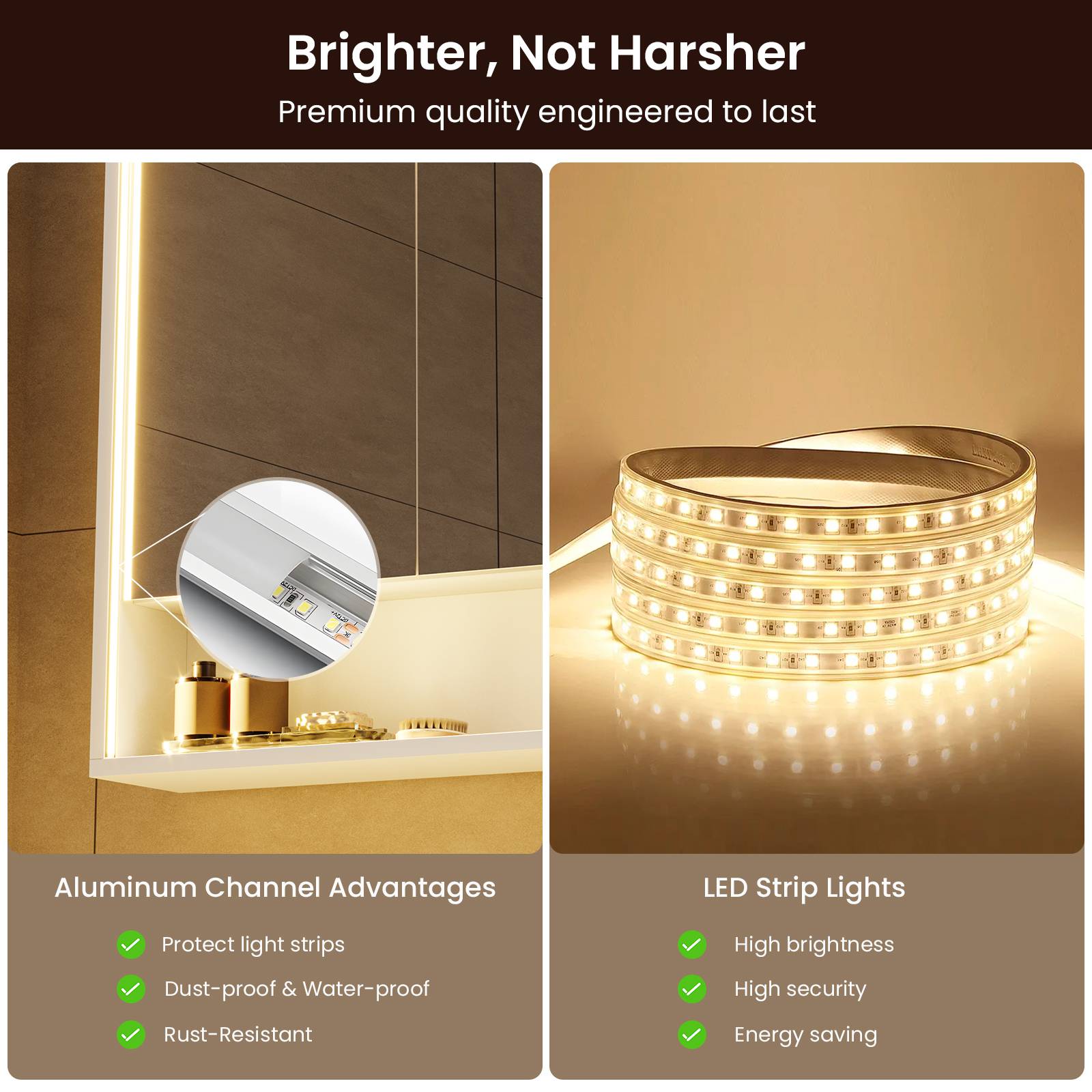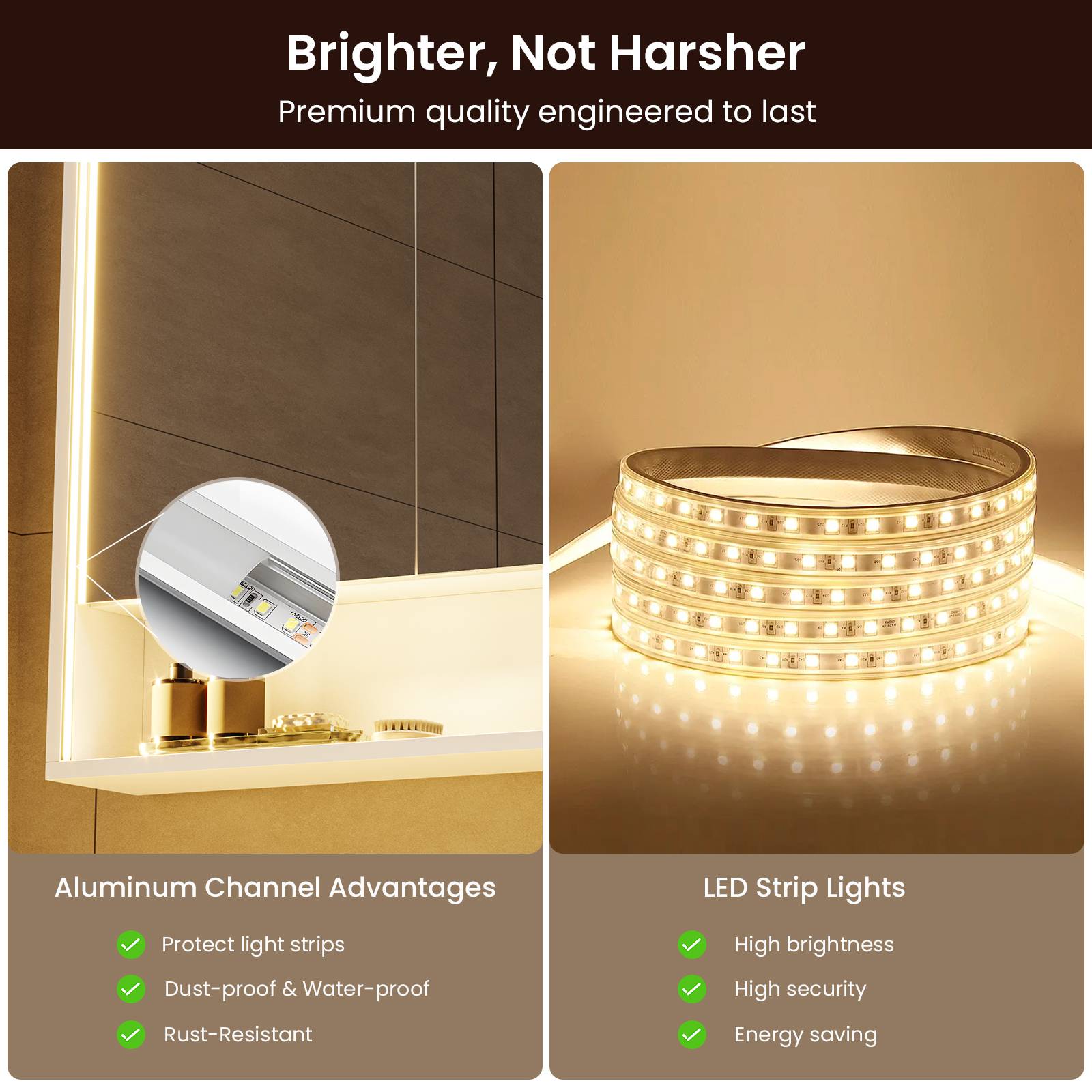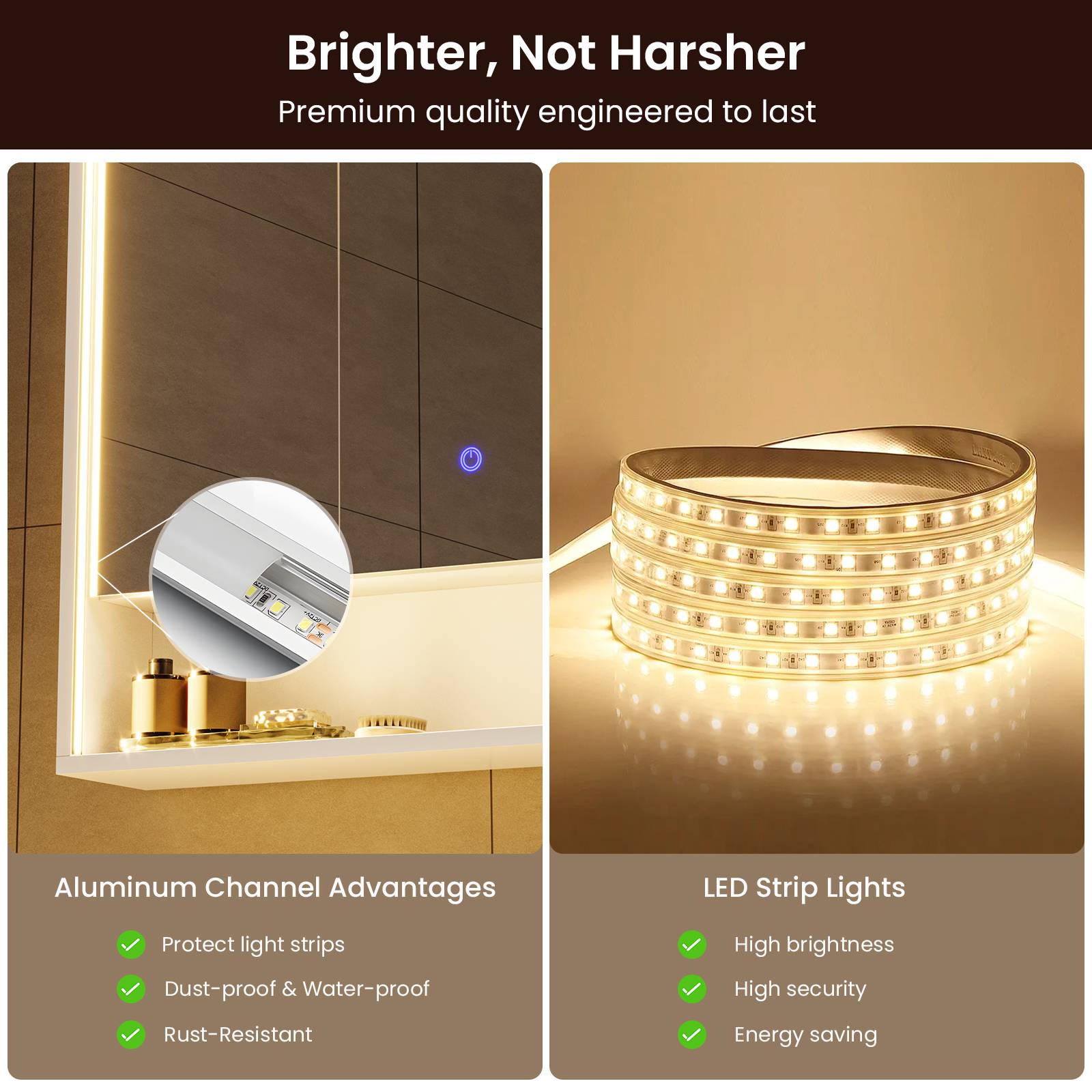 •【Professional Eye-Care Illumination】Featuring LED light strips embedded in aluminum channels along the sides and top of the mirror frame, it delivers crystal-clear, shadowless illumination — brilliantly bright yet never harsh.