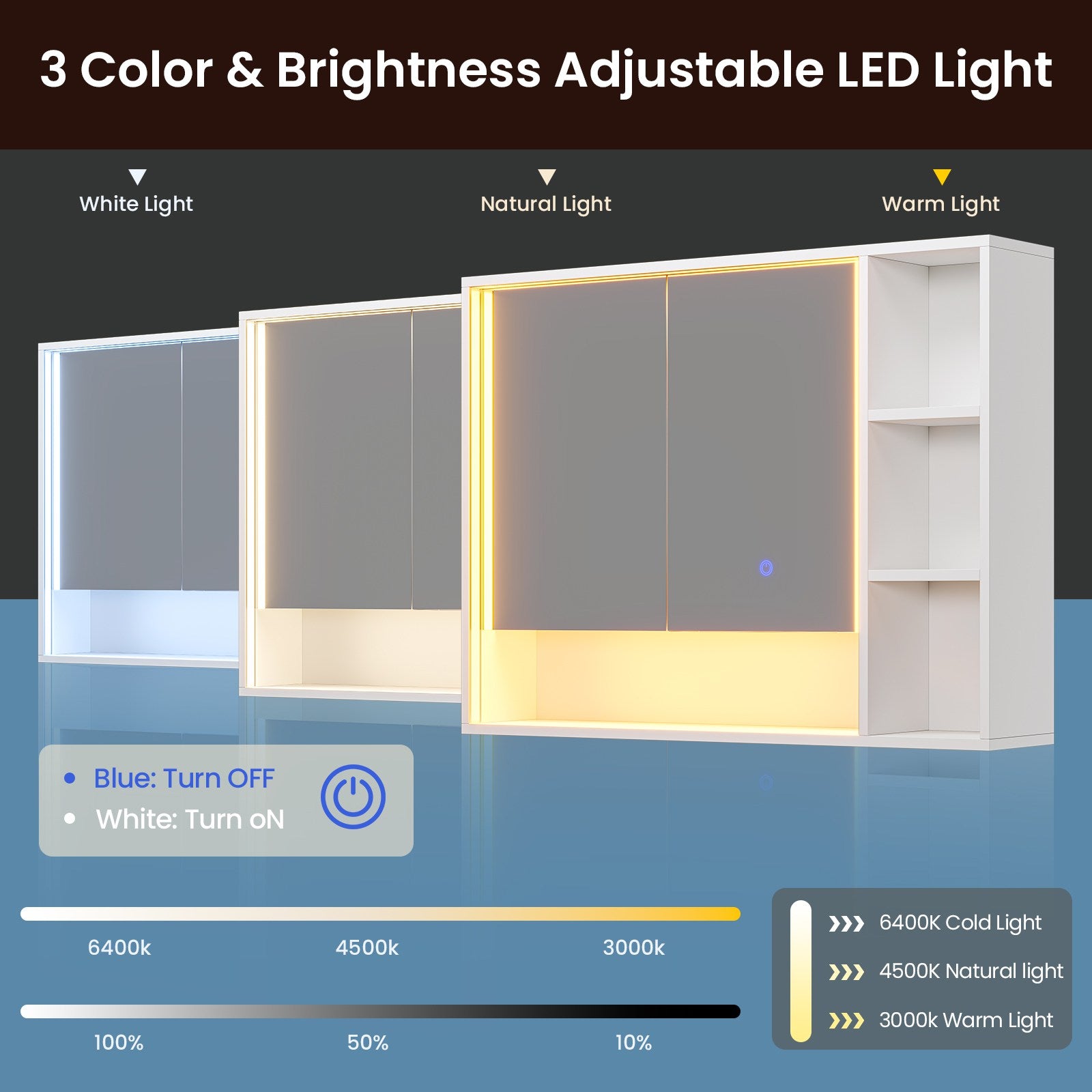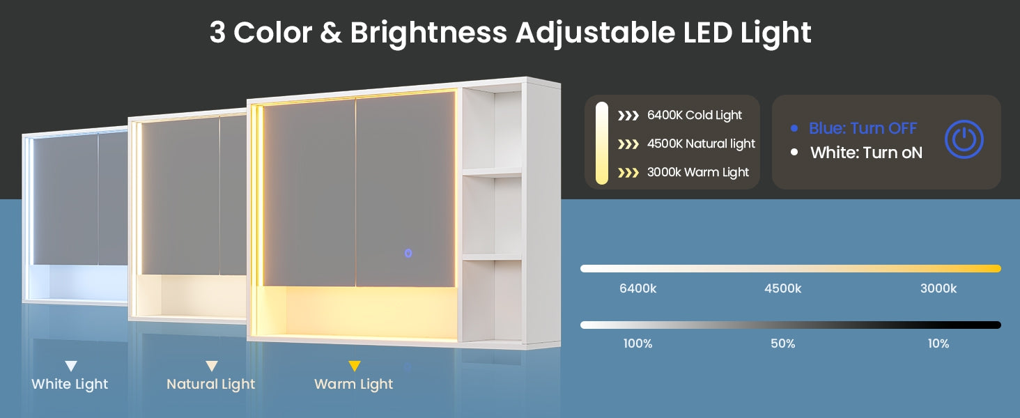 •【3 Color & Brightness Adjustable LED Light】This white medicine cabinet features an adjustable LED lighting system with 3 color modes to suit your needs for makeup application or bathroom illumination. The lights include a memory function, no need to adjust again every time.