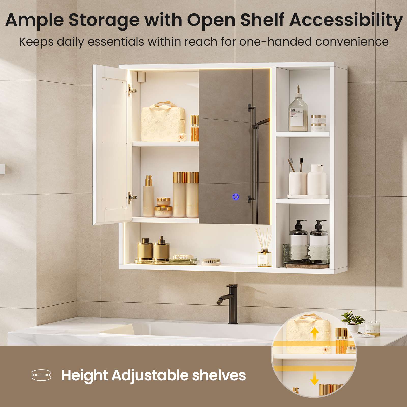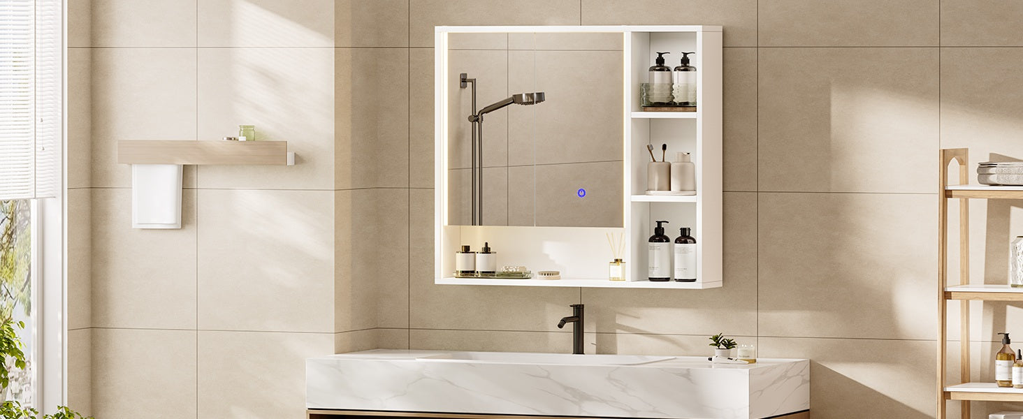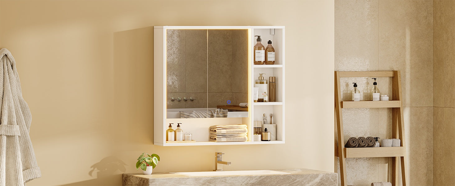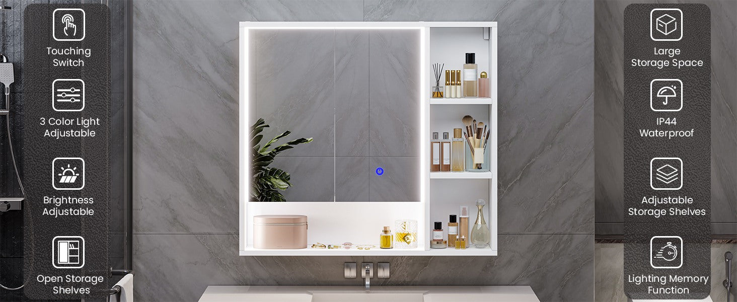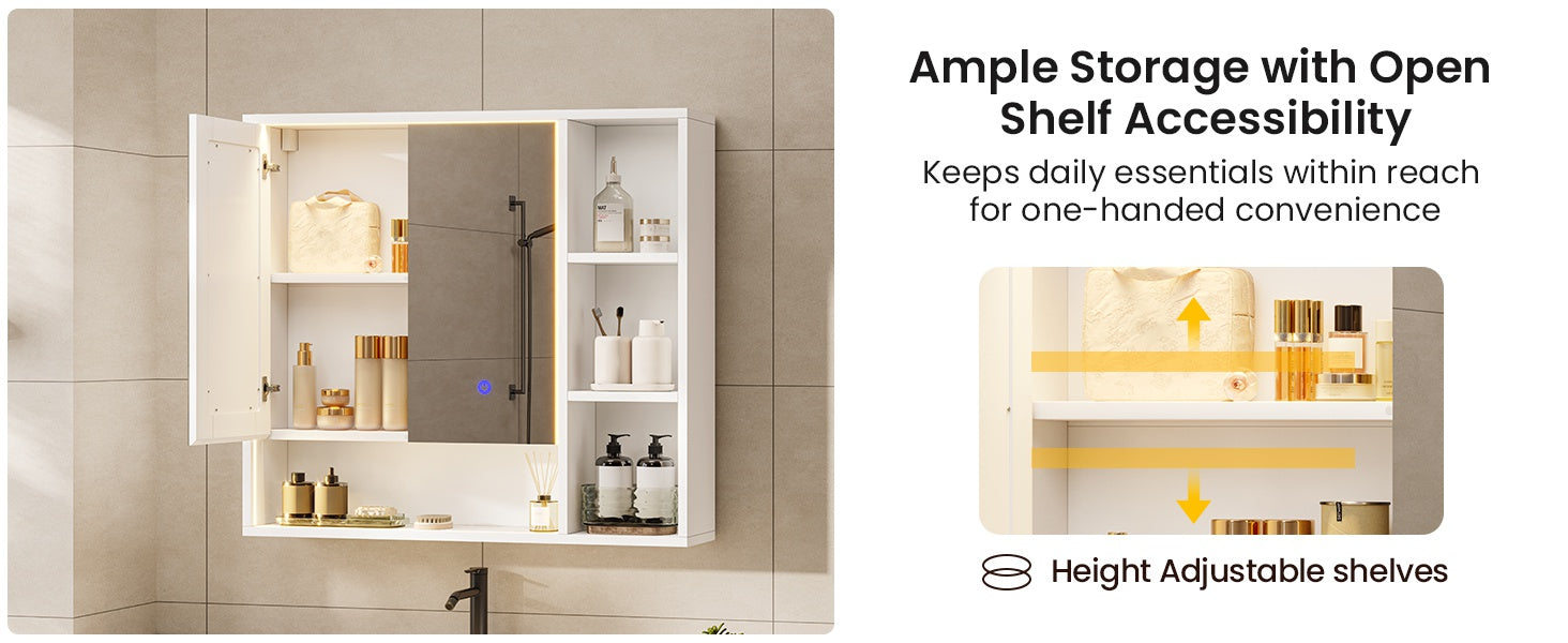 Hasuit | Lighted Medicine Cabinet with Mirror and Open Storage Modern Bathroom Cabinet with Adjustable Shelves