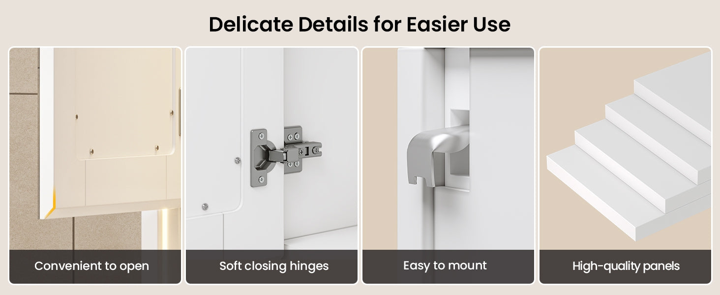 •【Easy Installation & Thoughtful Design】Comes with installation accessories and clear instructions, plus considerate details like integrated cable management and soft-close doors. The cabinet door hinges are adjustable. If you encounter difficulties when installing the mirrored door, fine-tune it by adjusting the hinge screws.