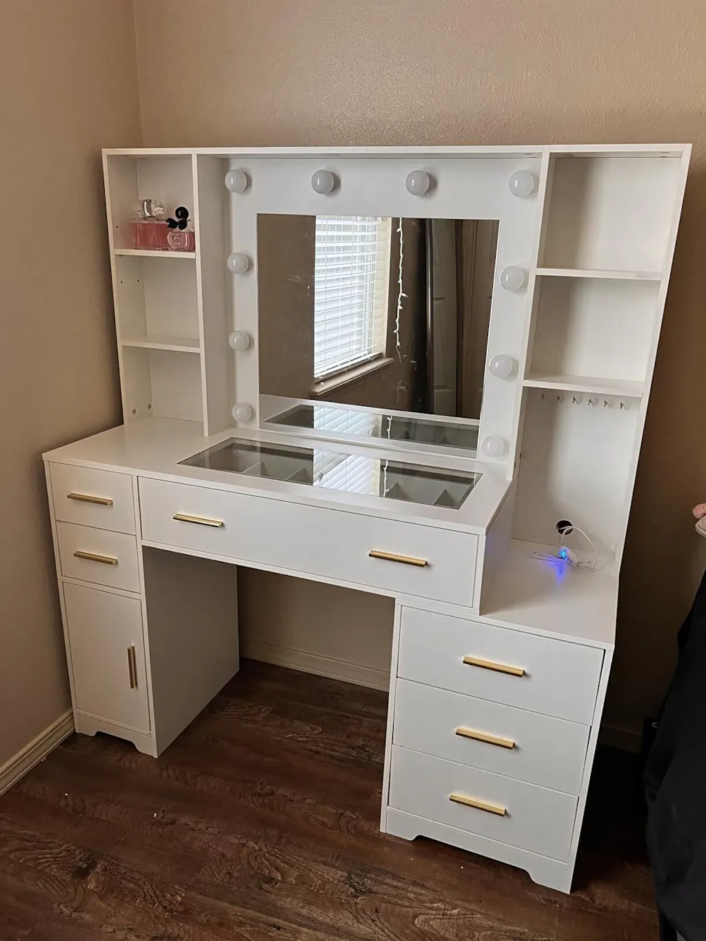 I love this white vanity! The mirror with lights is perfect, and having 3 lighting modes is super handy for different times of day. The built-in charging station is a nice touch, and there’s plenty of space in the drawers and storage cabinet for all my makeup and accessories. Totally worth it!